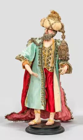 Balthasar in Gestalt eines bärtigen Orientalen in prunkvoller Tracht des 18. Jh. mit langer Schleppe, feiner Brokatstickerei sowie Turban mit aufwändig gearbeiteter Posamenterie, Terrakotta, farbig gefasst, Glasaugen, Seidenstoffe. Runder, ebonisierter Holzsockel, neuzeitlich. Ges.-H. 36,5 cm. Minim. Alters- und Gebrauchsspuren.
