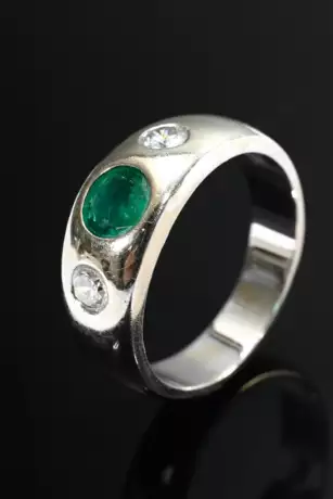 Lot 227 | Weißgold 585 Bandring mit facettiertem Smaragd und 2 Brillanten (zus. ca. 0.20ct/VSI/W), 10,4g, Gr. 57, Tragespuren