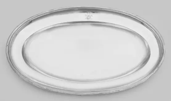 Silber. Länglich ovale Form. Vertiefter, glatter Spiegel mit gemuldetem Anstieg. Breite Fahne und mehrfach profilierter Rand. Auf der Fahne fein graviertes Spiegelmonogramm unter Grafenkrone. Gest. Beschauzeichen, Meister Alois Würth (wird Meister 1804), Taxstempel Österreich 1810 – 1824. Gew. ca. 405 g. L. 33,5 cm.