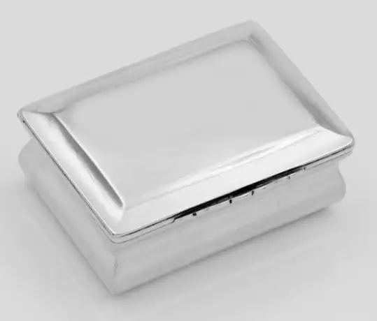 Silber. Rechteckiger Korpus mit gerundeten Ecken und rücks. scharniertem Deckel. Innen vergoldet, mit mittiger Trennwand. Gest. Beschauzeichen, Meister Anton Meixner (wird Meister 1785), Repunzierung für Österreich, Prag, 1806. Gew. 70 g.; L. 5,5 cm.