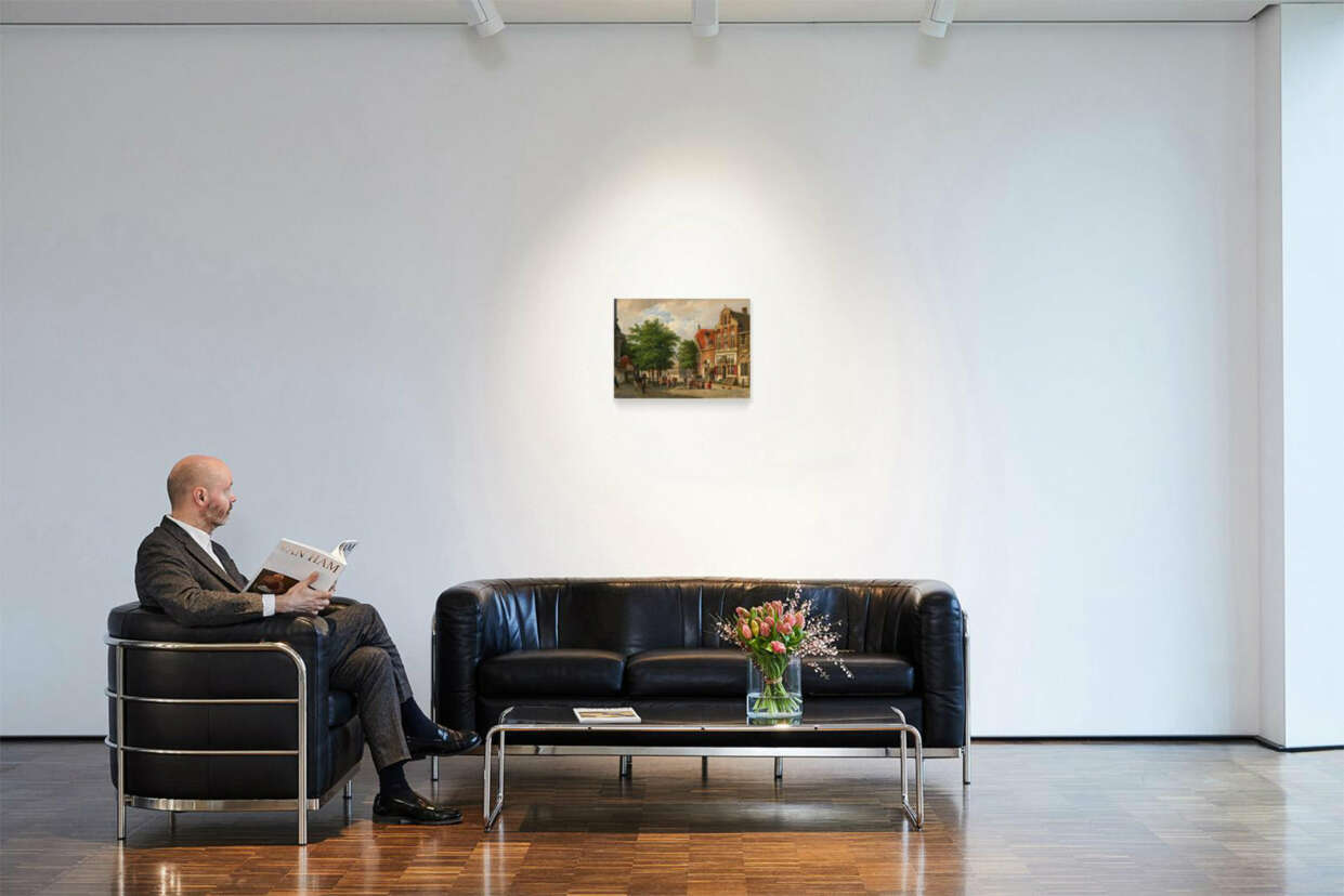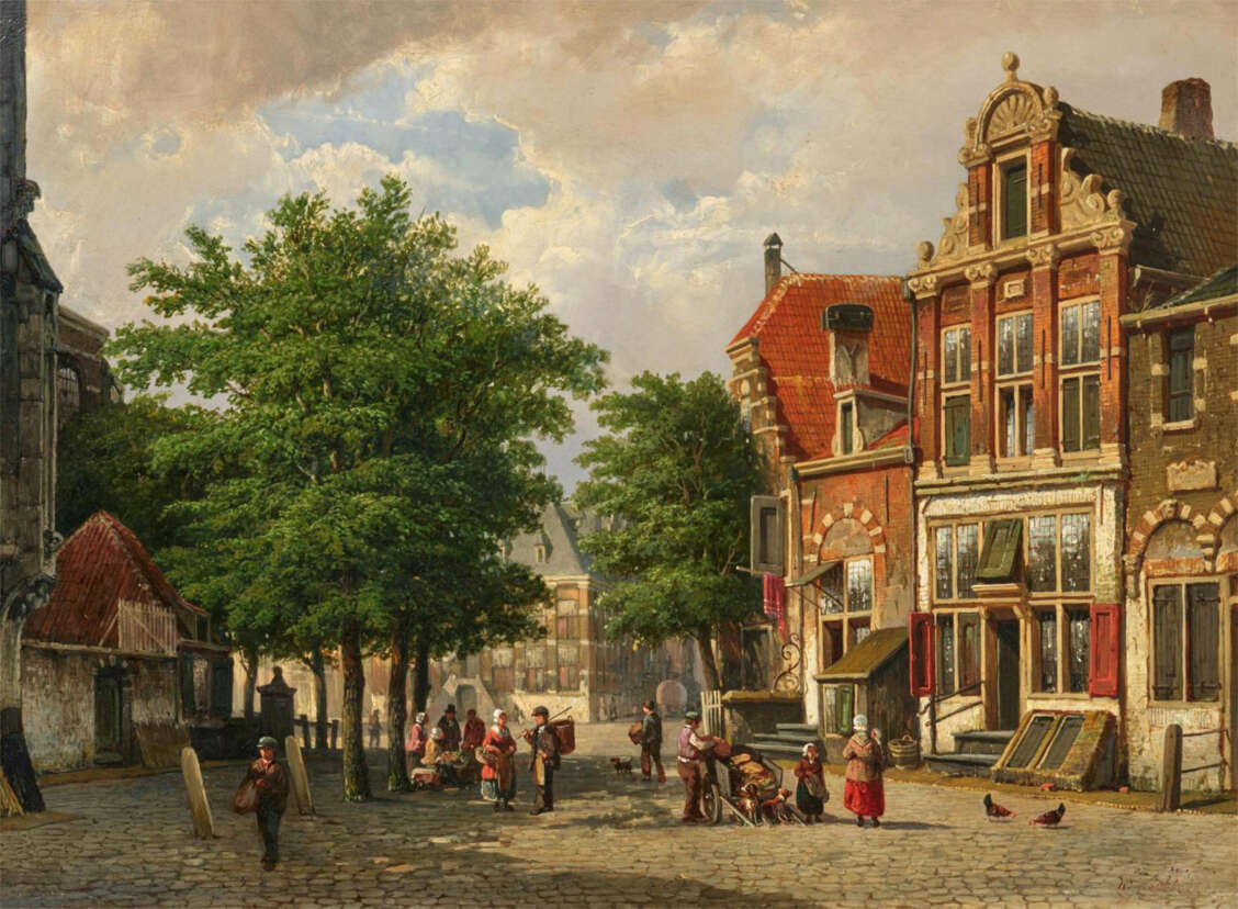 The painting presented here, a summer motif, is a typical work by Willem Koekkoek. Market and street scenes with people engaged in everyday activities or in conversation. Sunlight and shadows enliven the baroque urban architecture, which was also perceived as historical in the 19th century. Willem Koekkoek does not tell stories with his paintings, but conveys moods. At the height of industrialisation in the second half of the 19th century, these urban idylls may have had the same decelerating effect as they do today.