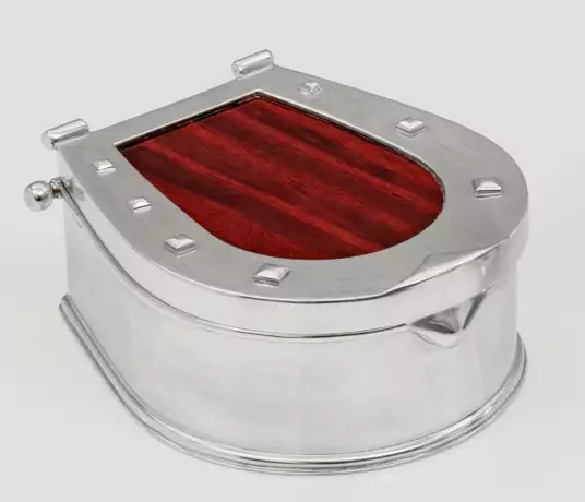 Sterlingsilber und Holz. Flacher Stand mit gering ausgestelltem Standring, übergehend in hufeisenförmigen Korpus mit glatter Wandung. Scharnierter Deckel mit Holz ausgekleidet und mit Nieten besetzt. Gest. 925, Beschauzeichen mit Herstellernummer "825". Gew. ca. 560 g. H. 5,5 cm. 13,5 cm x 11 cm.
