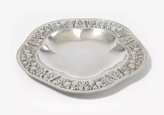 Silber. Meistermarke Posen. Fünfpassige, weite Form. Abgeflachte Fahne mit reichem vegetabilem Reliefdekor und Perlbordüren-Abschluss. Halbmond/Krone, Meistermarke, Feingehalt 800. B 33,2 cm, ca. 700 g.