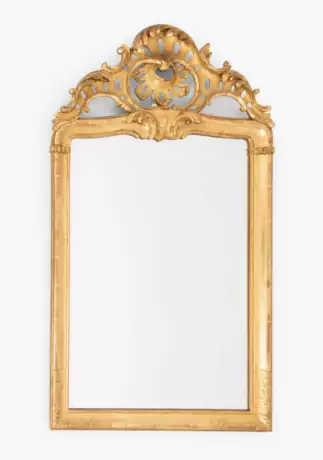 Mitte 20.Jh., in der Art Funk. Karniesrahmen mit ornamental gravierten Ecken. Reich geschnitztes Rocaillenfronton mit Muschel. Auf rotem Poliment vergoldet. 94 x 51 cm.