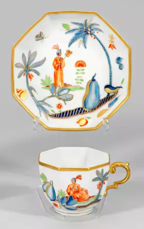 mit Untertasse. Oktagonale, kelchförmig sich erweiternde Form. Umlaufend der Wandung bzw. im Spiegel fantasievoller Chinoiseriedekor mit blühender Gartenlandschaft und Chinesen. Feine polychrome und unterglasurblaue Malerei mit Goldstaffage. Aus der Kollektion "Limitierte Meisterwerke". Limitierung "073/100". Zertifikat. Schwertermarke mit Goldsignet. Tassen-H. 6 cm. Untertassen-D. 14 cm.