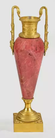 Roséfarbener Rhodonit und vergoldete Bronze. Über quadratischer Plinthe mit applizierten Kranzmotiven gestreckter balusterförmiger Korpus. Seitlich erhaben reliefierte Maskarons sowie schmale Schwanenhenkel. H. 36 cm.