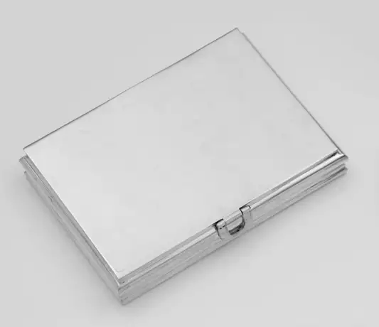 Sterlingsilber und Holz. Rechteckiger Korpus mit flachem Stand und flachem, scharnierten Deckel. Mit Wülsten und Profillinien umzogene Wandung. Schauseitig scharnierter Öffner. Innen holzverkleidet. Gest. 925, "Hecho en Mexico". Ges.-Gew. ca. 340 g. H. 2 cm. 10 cm x 14 cm.