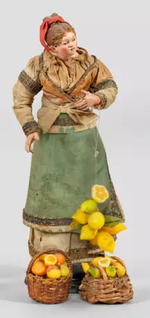 Junge Frau mit hochgesteckter Frisur in bäuerlicher Tracht des 18./19. Jh. mit einem Zitronengebinde sowie zwei Körben mit Zitrusfrüchten. Terrakotta farbig gefasst, Glasaugen, Stoff, Weide, Wachs. Runder, ebonisierter Holzsockel, neuzeitlich. Ges.-H. 23 cm. Minim. besch./Alters- und Gebrauchsspuren.
