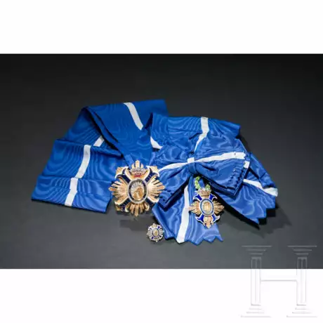 Konvexer brillantierter Bruststern aus 18 ct Gold (getestet) mit mehrteiliger vernieteter Auflage, die obere Kreuzauflage und das Medaillon mit à jour (beidseitig dem Tageslicht ausgesetzt) gefassten blauen Steinen und Brillanten (geprüft), das untere Kreuz weiß emailliert. Die vernietete imperiale Krone (Franco-Zeit) mit Brillanten und Farbsteinen besetzt. Rs. die stark verzierte Vertikalnadel mit Sicherheitsverschluss und zwei Tragehaken. Breite ca. 74 mm, Gewicht 74 g. Schärpenkreuz aus 18 ct Gold (getestet), die vernietete Auflage farbig emailliert und der innere Medaillonreif mit Brillanten besetzt, die vernietete imperiale Krone mit Brillanten (geprüft) und Farbsteinen besetzt, am beweglichen Lorbeerkranz befestigt. Breite ca. 50 mm, Gewicht 32,5 g. Gewässerte blaue Schärpe mit mittigem weißen Durchzug. Dazu die Miniatur an Knopflochbefestigung sowie der schwarze Samteinsatz des Etuis. Jeweils nicht punziert.