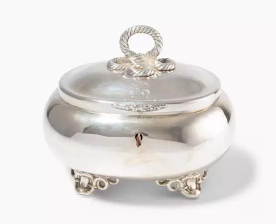 Ovale, gebauchte Form auf Volutenfüssen. Scharnierdeckel mit Griff in Form einer verschlungenen Kordel und mit gravierten Ligaturinitialen. H 14,5 cm, 388 g.