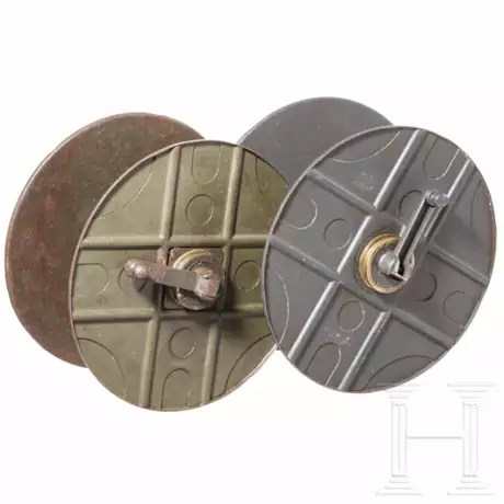 Stahl, feldgrau lackiert. Zwei starr durch gelochten Zylinder miteinander verbundene Scheiben (Stempel Adler/"4, BSW, 1936"), starre, ausklappbare Kurbel. Dazu ein olivgrün lackiertes Exemplar, gestempelt "Su 25". Gebrauchs- und Altersspuren. Maße je 17,5 x 17,5 x 11 cm.