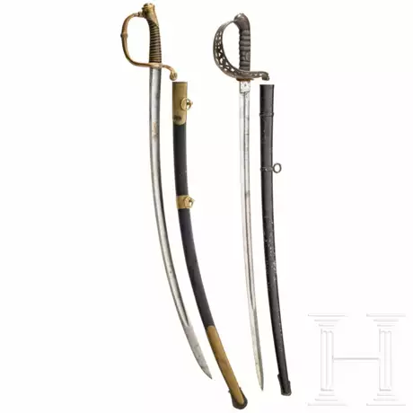 Jeweils zusammengestellt aus Originalteilen. Kräftig geschwungene Rückenklinge (fleckig), beidseitig die eingeätzte, vergoldete Herrscherchiffre "L" unter Krone (Bayern), französisches Bronzegefäß (Vergoldungsspuren) mit gut erhaltenem Griff und Drahtwicklung, schwarz nachlackierte Eisenscheide mit Buntmetallbeschlägen. Dazu ein österreichischer Kavalleriesäbel M 1869 mit einseitig gekehlter Rückenklinge, darin die englische Messingmarke "Proved" und auf der Gegenseite der Stempel "Hörster Solingen", Eisenkorbgefäß, drahtumwickelte Fischhauthilze, schwarz nachlackierte Eisenscheide (berieben). Partiell leicht beschädigt, Altersspuren. Länge 102 und 99 cm.