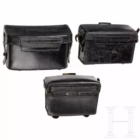 Beide Taschen aus geschwärztem Leder, jeweils für drei Packschachteln mit je 15 Patronen. Erste Tasche mit Truppenstempel "110.L.J.R.III.B". Ziehriemchen und Rahmen aus Pergamentleder intakt, leichte Gebrauchsspuren. Zweite Tasche mit Truppenstempel "R.J.R.10.III.B" sowie "10.J.R.1900". Abgeändert aus Patronentasche 88. Ziehriemchen fehlt, Pergamentlederrahmen gerissen und rechter Verschlussriemen mit Fehlstelle. Deutliche Tragespuren, Leder teilweise brüchig. Dazu eine Sanitätstasche in Kastenform mit Beschlagteilen aus Eisen. Auf der Rückwand unleserlicher Truppenstempel "3.B.L.". Am Deckel Abnutzungsspuren, ansonsten mit nur leichten Gebrauchsspuren.