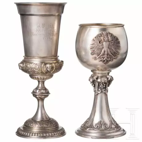 Pokal aus 13-lötigem Silber zum 1. Deutschen Bundesschießen in Frankfurt am Main mit innen vergoldeter Kuppa, schauseitig im Eichenlaubkranz der Schriftzug "Deutsches Schützenfest zu Frankfurt a. M. 13. Juli 1862.", auf der Gegenseite ein aufgelegter, sehr detailliert gearbeiteter Adler, Schaft mit relieferten Weintrauben, am Rand des Standfußes die Hersteller- und Feingehaltsangabe "Schürmann & Comp. in Frankfurt M. - 13.". Dazu ein Neorenaissance-Pokal mit Gravur "3. Preis Feldscheibe Oktoberfest München 1886", am Standfuß gemarkt "WB 800"(?), kleine Delle am Oberrand. Partiell leicht beschädigt, Altersspuren. Höhe 19 und 22,5 cm, Gesamtgewicht 0,4 kg. Das 1. Deutsche Bundesschießen 1862 wurde noch als "Schützenfest" bezeichnet.