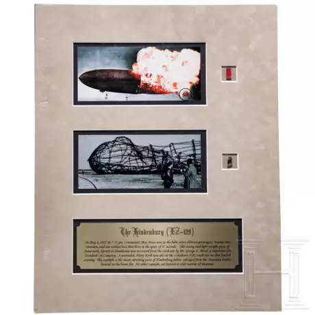 Ein kleines Stück des Hoheitsabzeichens und ein Stück vom Rahmen aus Duraluminium, veranschaulicht dargestellt auf einer Schautafel, Maße der Tafel 40,5 x 50,5 cm. Beide Stücke stammen aus den Überresten des LZ-129, geborgen von George L. Mead and Harry Kroh. Am 6. Mai 1937 wurde das Luftschiff bei der Landung in Lakehurst (New Jersey, USA) zerstört. Ursache für den Absturz war eine entzündete Wasserstofffüllung. Selten zu finden!