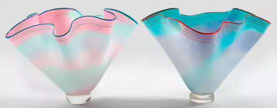 Über rundem Stand in "Fazzoletto"-Form aufgezogene Kelchvasen. Farbloses Glas über türkisblau/violett bzw. türkis/rosafarbenen Unterfängen mit roten bzw. dunkeltürkisen Bandauflagen im oberen Bereich. Sign.; H. 24 cm - 25,5 cm.