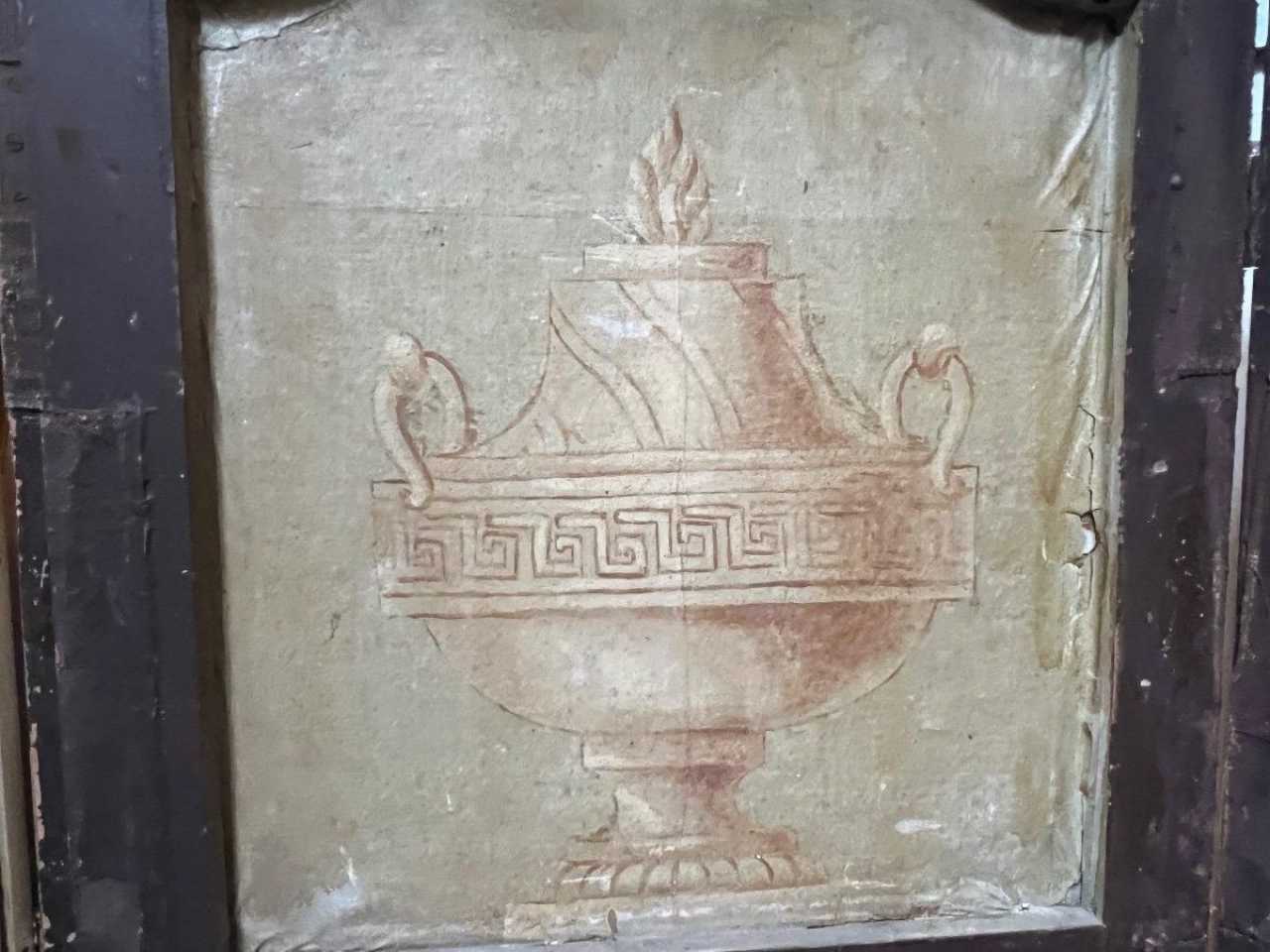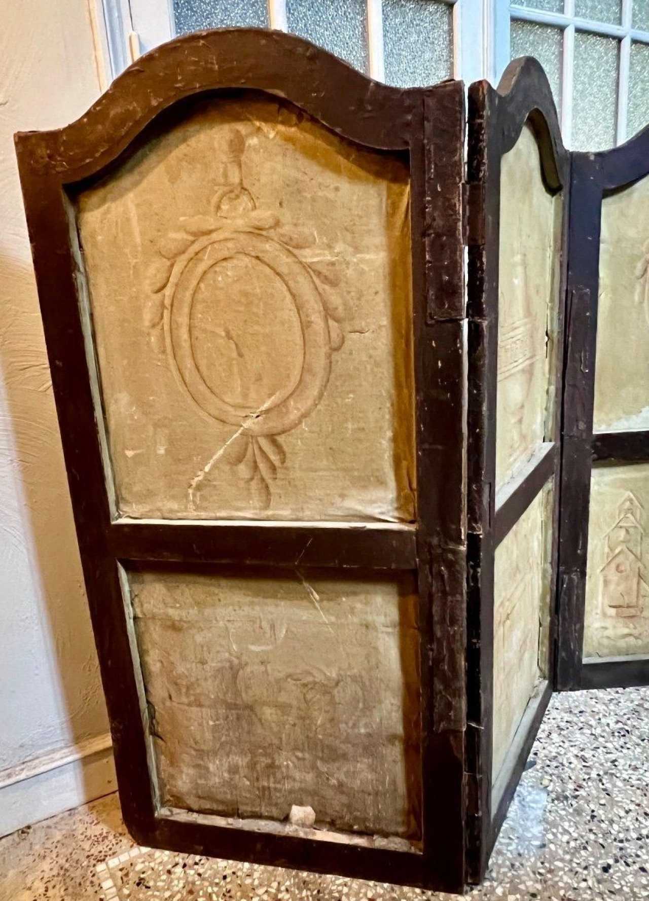 Presenting you this 18th-century antique three-leaf folding screen with oil-on-canvas paintings on the front and oil-on-paper paintings on the back.Some tears consistent with the age and use of this piece can be seen in the paper on the reverse, however the front side of this piece is in excellent condition. Each of the three paintings consists of elements referring to music, warriors, and agricultural objects.