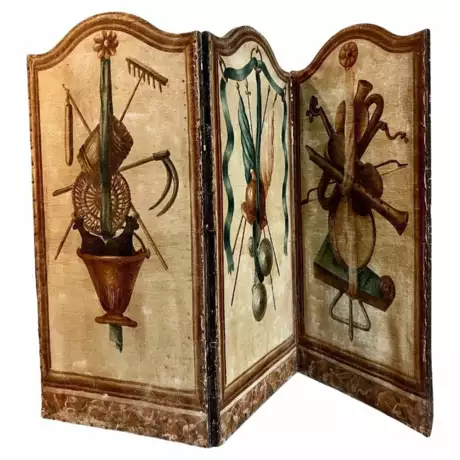 Presenting you this 18th-century antique three-leaf folding screen with oil-on-canvas paintings on the front and oil-on-paper paintings on the back.Some tears consistent with the age and use of this piece can be seen in the paper on the reverse, however the front side of this piece is in excellent condition. Each of the three paintings consists of elements referring to music, warriors, and agricultural objects.