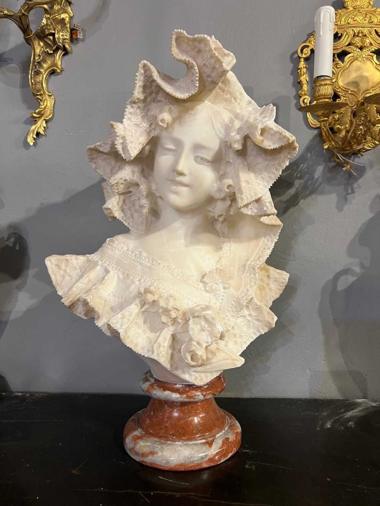 We present you with this exquisite large bust of a beautiful young lady with a large hat, carved in prestigious antique white statuary marble. A unique work of the highest quality and detail, rendering the subjects face, its clothes and especially the hat to appear as if made of lace which in turns contributes to a great visual impact.This bust was hand-sculpted in Italy and is a work of art belonging to the renowned Fratelli Romanelli sculpture workshop.About Fratelli Romanelli:Several generations of Romanelli sculptors have passed through the Florentine sculpture studios doors: Pasquale Romanelli (1812-1887), his son Raffaello (1856-1928), followed by his son Romano, then Folco and currently brothers Raffaello and Vincenzo Romanelli. The ateliers beginnings trace back to Lorenzo Bartolini (Italian, 1777-1850) who lived in Paris as the Bonaparte familys official sculptor. After the downfall of Napoleon, he returns in Florence and has his first studio in via della Scala. Pasquale Romanelli would become his prized pupil and go on to begin the Romanellii family studio in Florence. T.