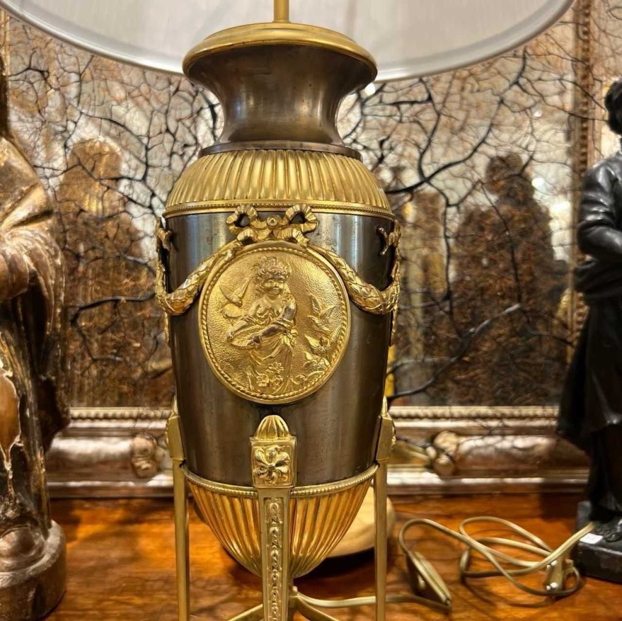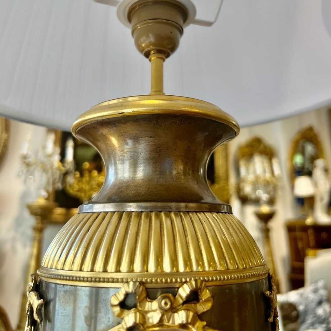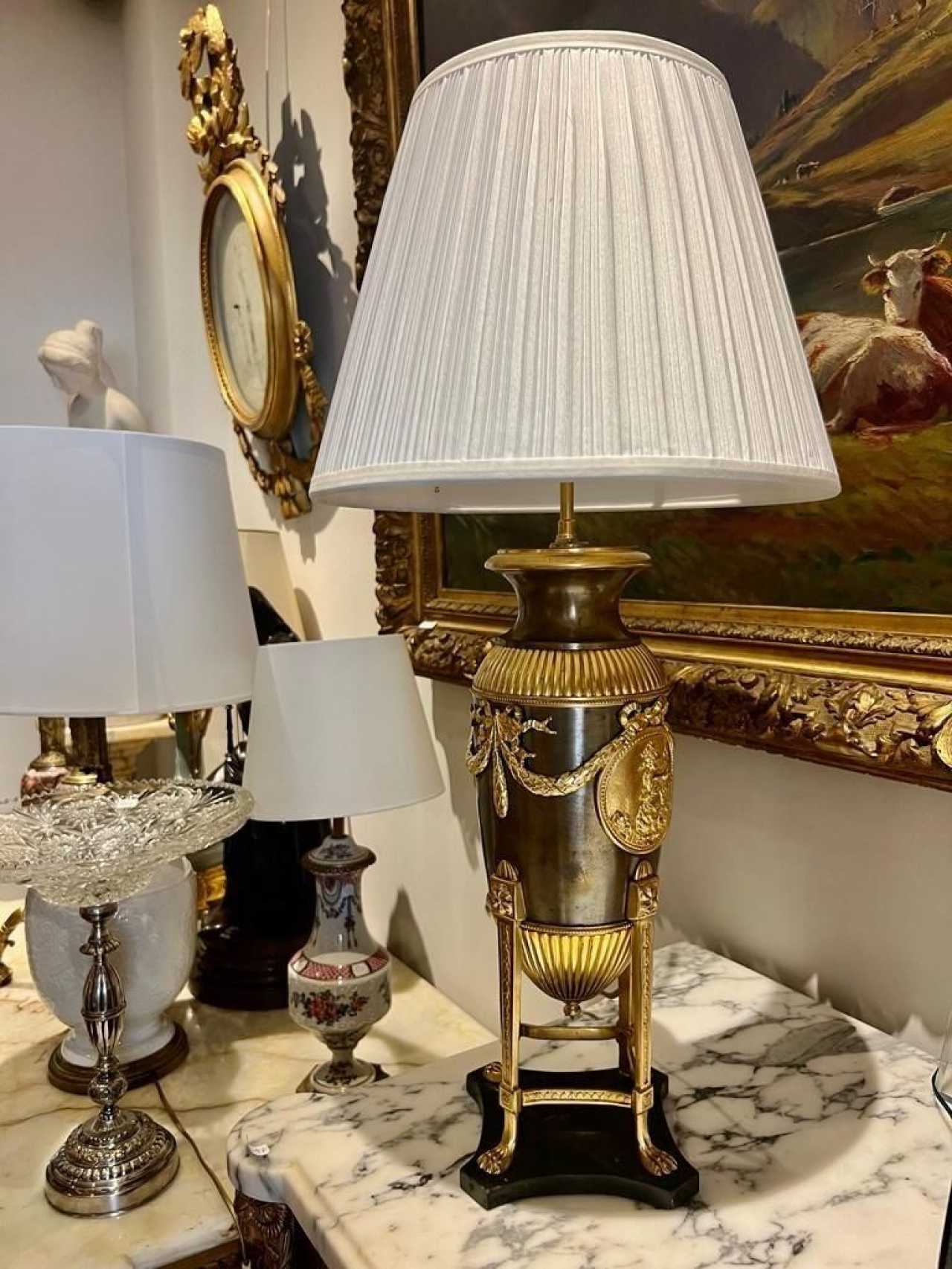 A large four-legged lamp in the style of the First French Empire with a gilded bronze and brown patina finish, resting gracefully on a marble base. Adorned with intricate garlands and two medallions featuring a cherubic figure, this lamp boasts an elegant design. Its legs terminate in ornate claw-shaped feet. This highly decorative piece would make an excellent option for illuminating a desk and it dates back to the Napoleon II era. It has been carefully restored and retrofitted with modern electrical components for contemporary use.Please note that this piece is available for purchase without the lampshade.Measurements:Diameter: 15 cmHeight: 50 cm