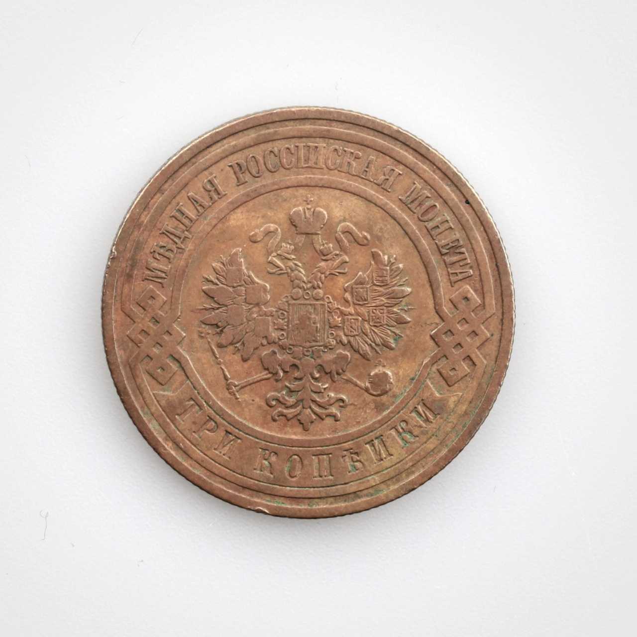3 копейки медью 1908 года.На аверсе:3 копейки 1908 года с.п.б. в лавровом венке.На реверсе: медная российская монета три копейки в орнаменте вокруг герба.Вес:9,76 грДиаметр 2,8 смТолщина 2 мм
