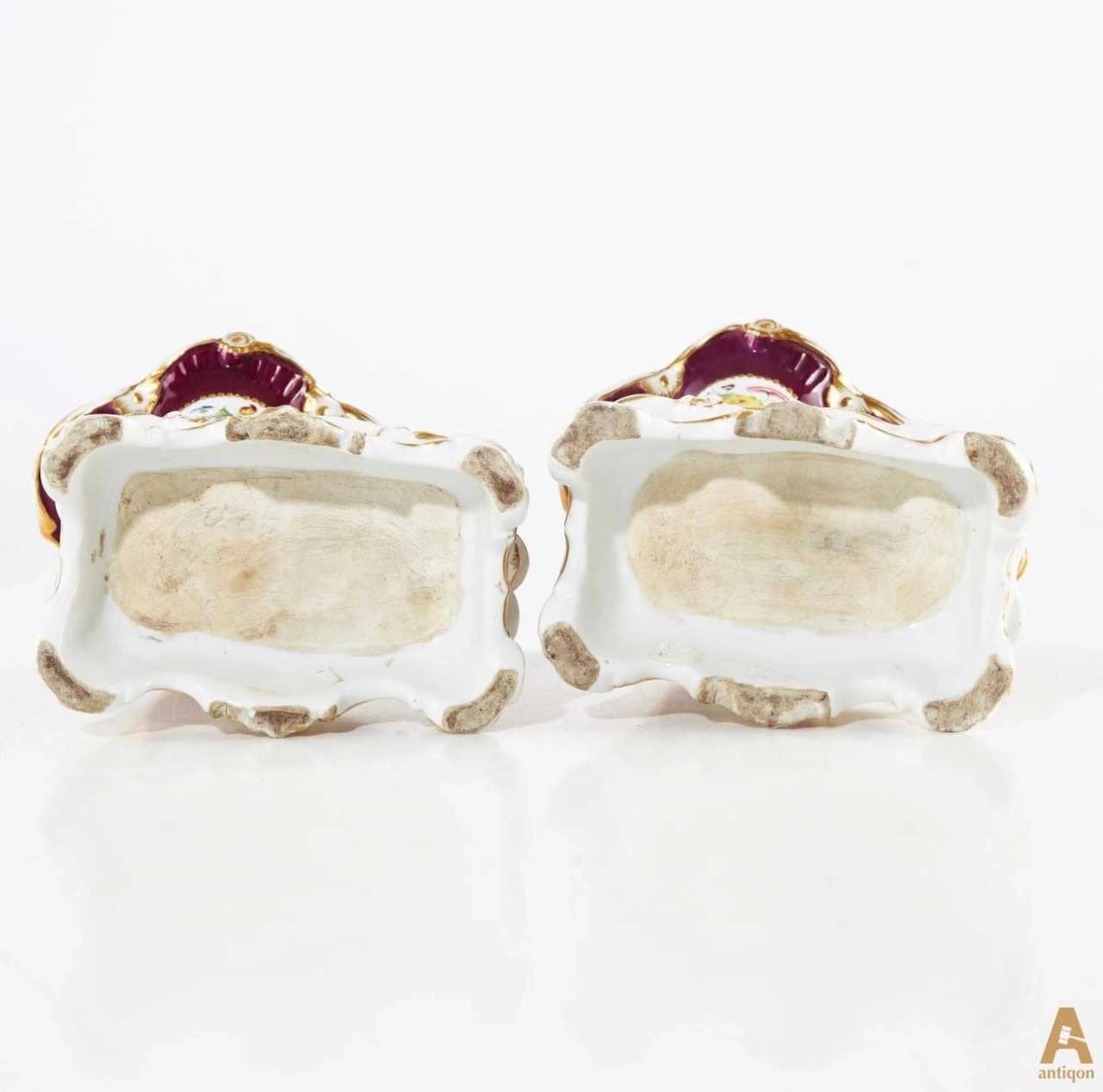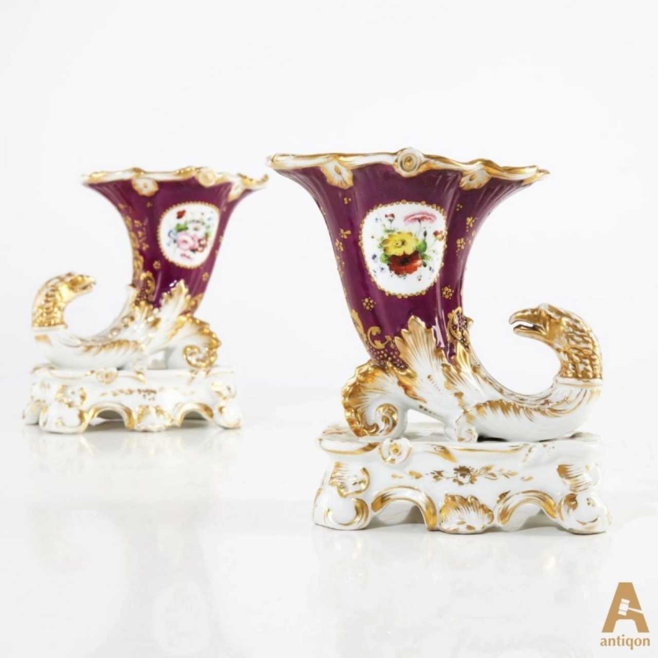 Пара ваз середины 19 века. Форма символизирует рог изобилия и головы грифонов. Без клейма. Предположительно модель завода А.Г. Попова, Россия.