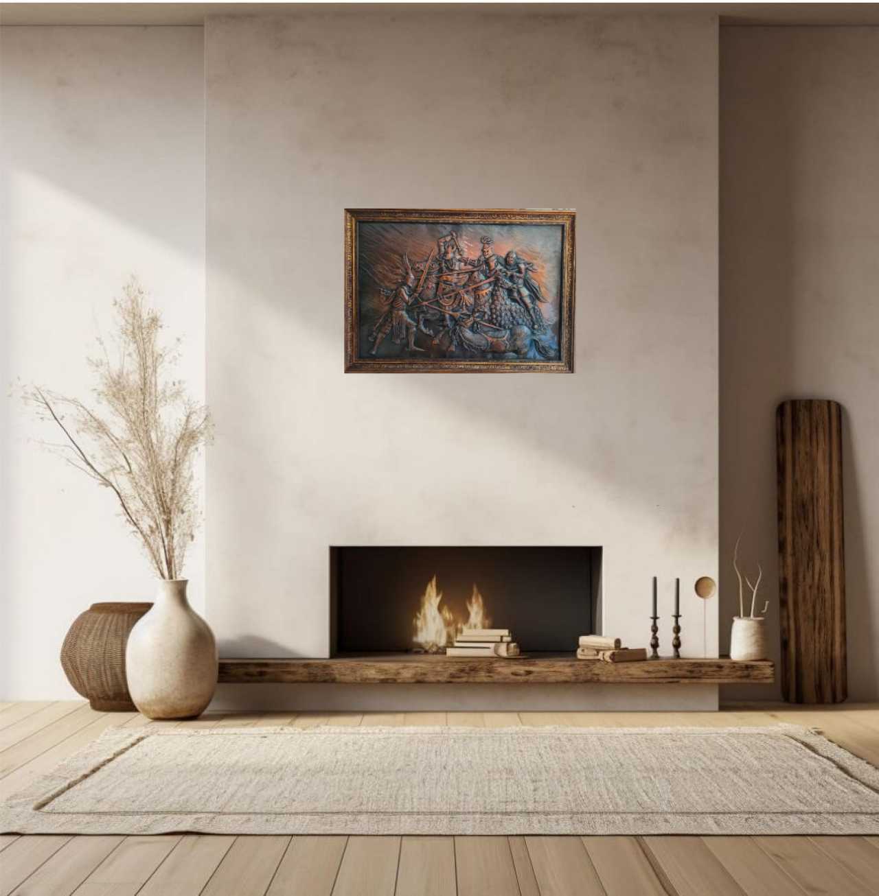 Картина изготовлена из целого медного листа. Использованы приёмы металлопластики ,торевтики и чеканки. Ювелирная проработка мелких деталей. Проведено патинирование и полировка. Задник снят,НЕ ГАЛЬВАНОПЛАСТИКА!