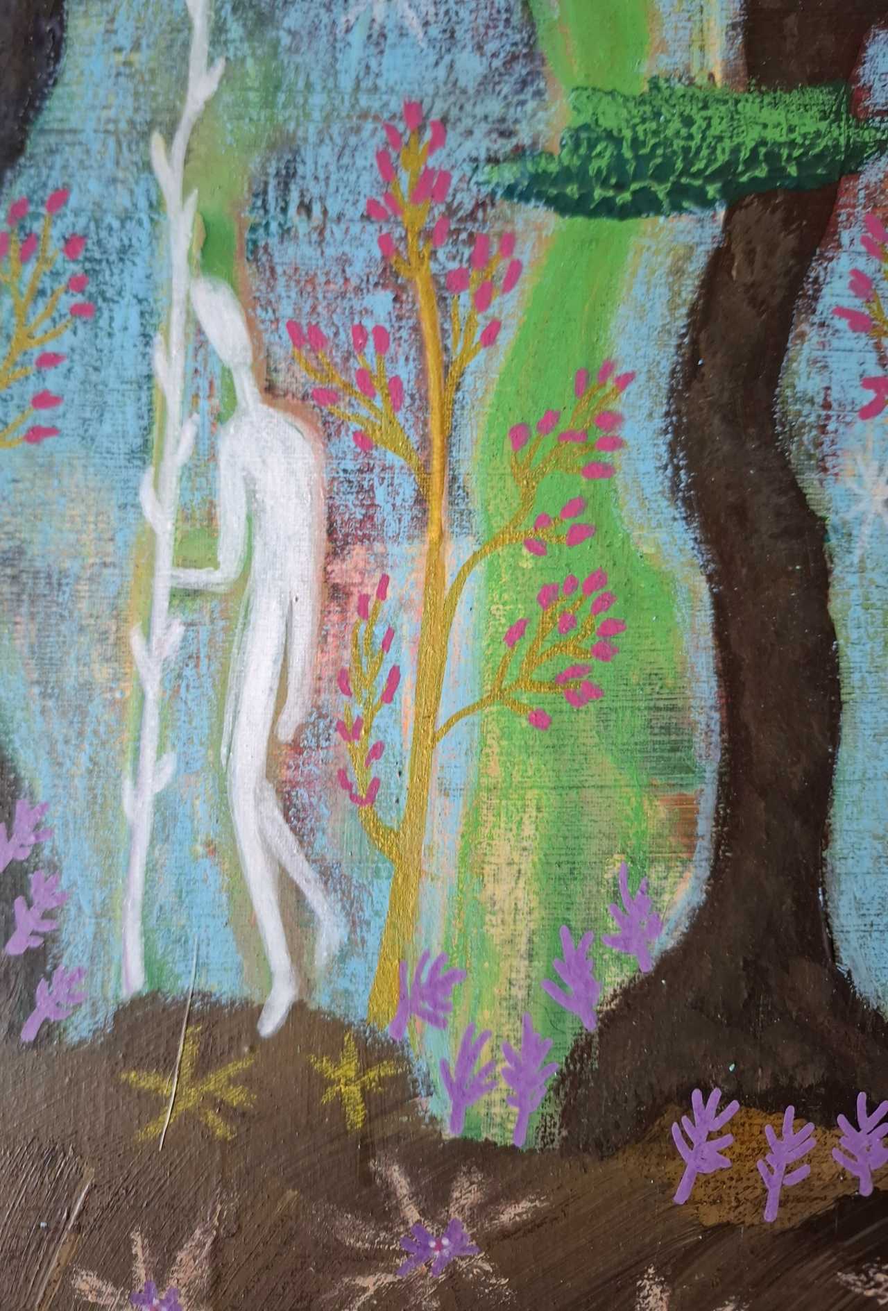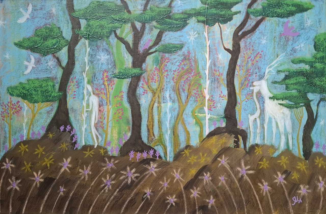 В этом лесу все дышит мягким светом: деревья, животные, даже воздух кажется сотканным из снов. Пространство живет вне времени: тишина полна движений, а цвета становятся языком взаимного признания между существами и природой. Белые фигуры, словно духи, выходящие из самой земли, являются хранителями ритмов роста. Это видение первозданного мира, где жизнь течет без слов, в едином дыхании земли и неба.