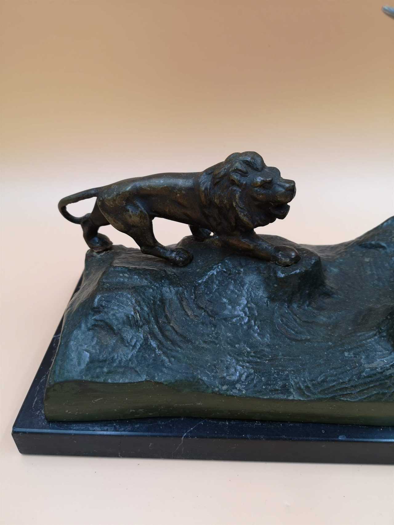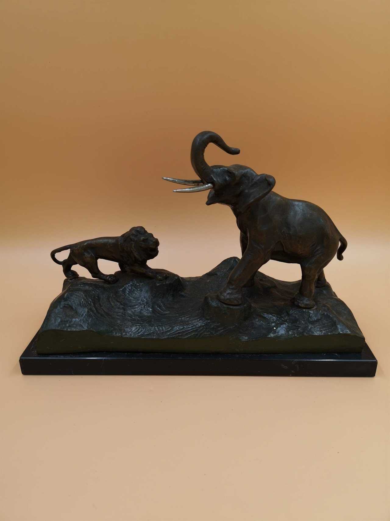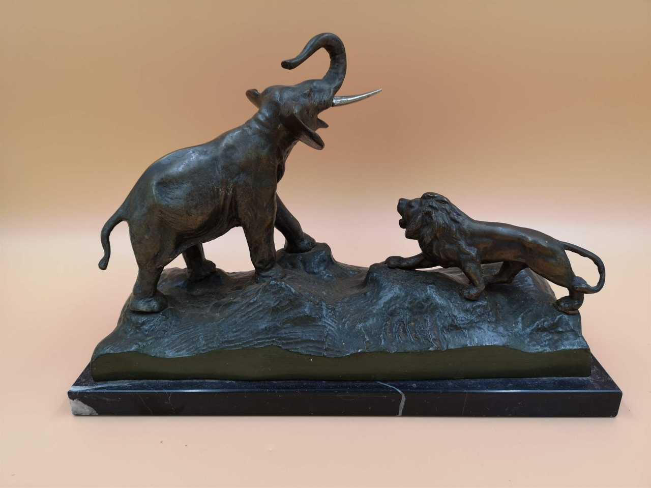 Антикварная бронзовая фигура «Слон и лев». Конец XIX века. Франция. Идеальное состояние. Бронза, мрамор. Высота 23 см; 34x14 см.
