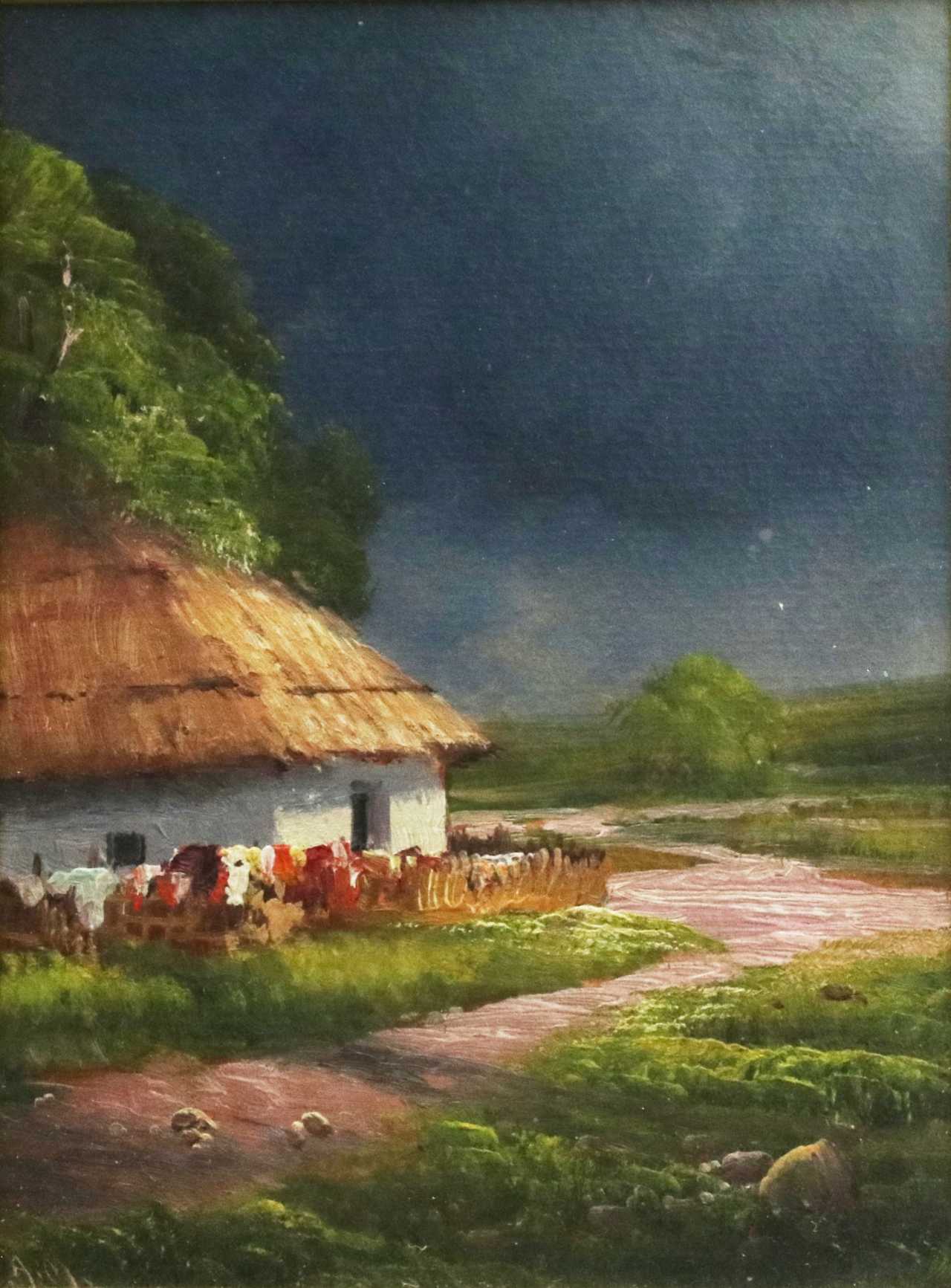 Перед дождем. Вид на проселок и украинскую хату. Атмосферный пейзаж с синью дождевой тучи, над ещё залитым солнцем проселком, опоясывающим угол украинской хаты, на плетени которого, сушится бельё. Справа в низу: А.М. По М.Б.Иткину возможно Х.А.Брендекильде начало 20 века. Размер работы: 15х11 см.