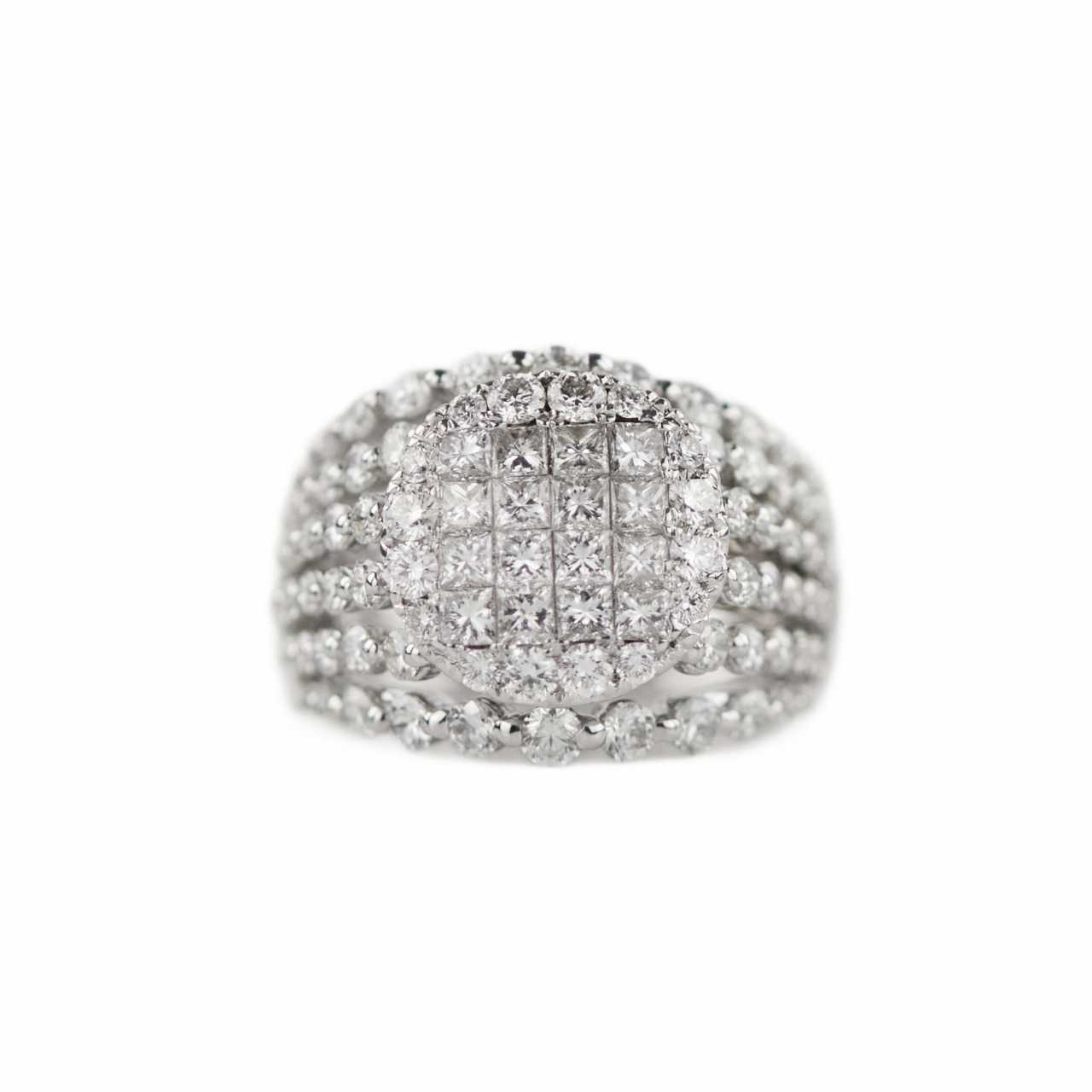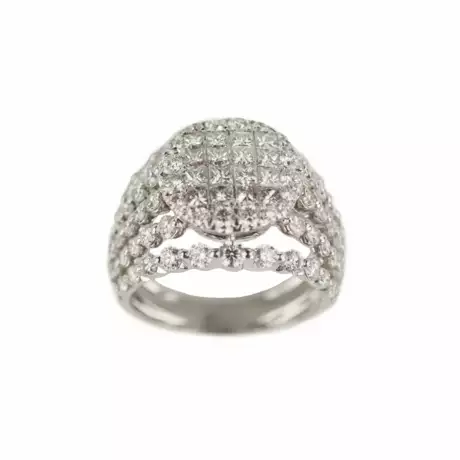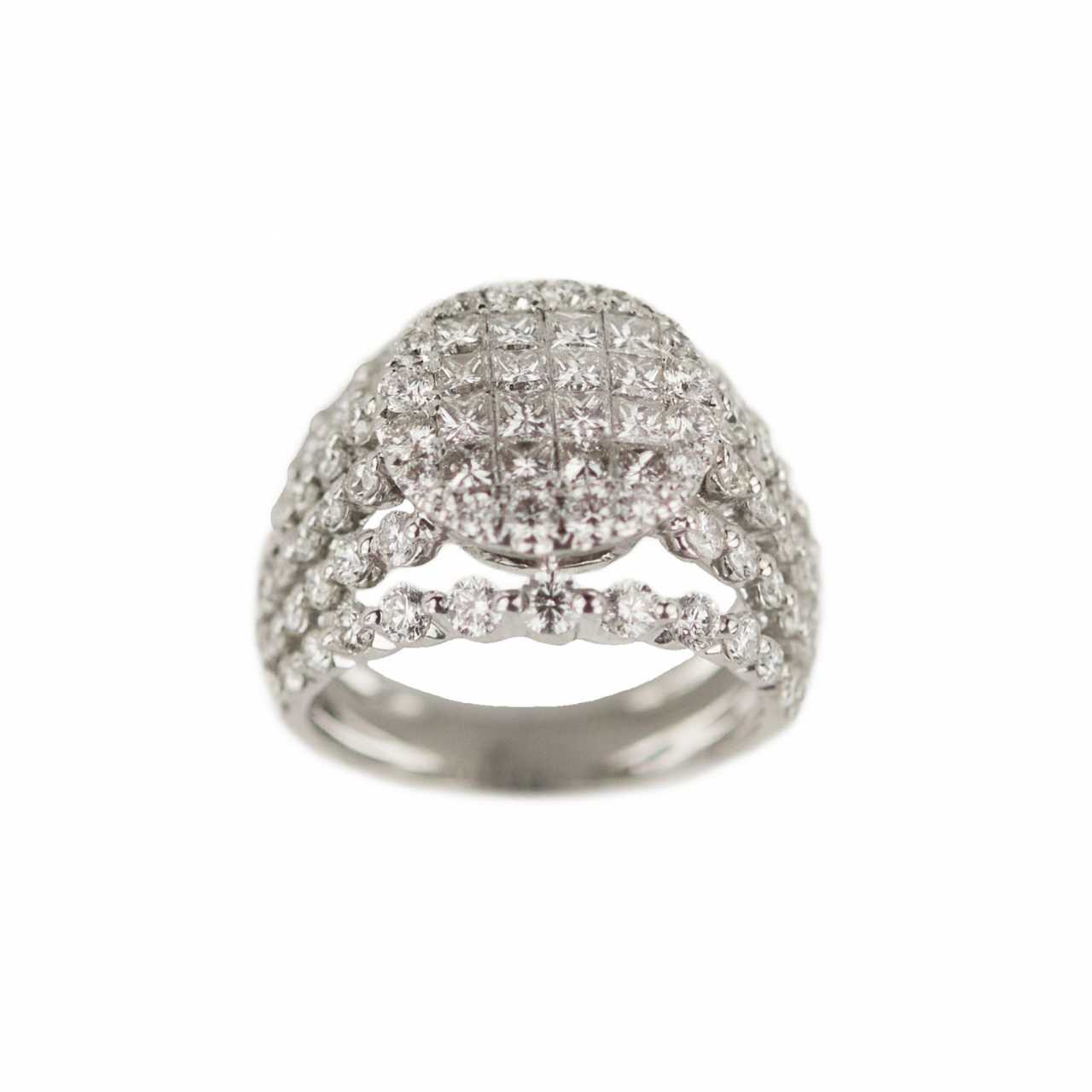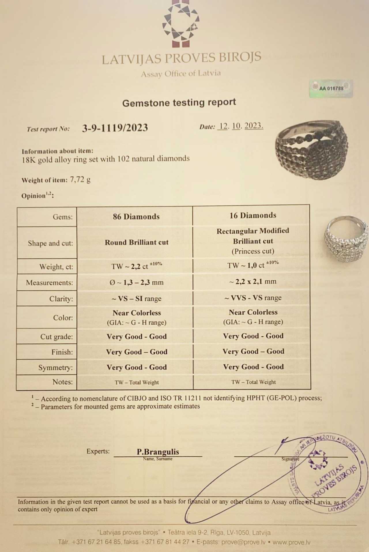 Золотое кольцо 18к с 102 бриллиантами. 86 камней - 2,2 карата, VS-SI. 16 камней: 1 карат, VVS-VS.Размер колца: 16,5. Вес: 7,72 гр. Сертификат Латвийской пробирной палаты: 3-9-11192023.