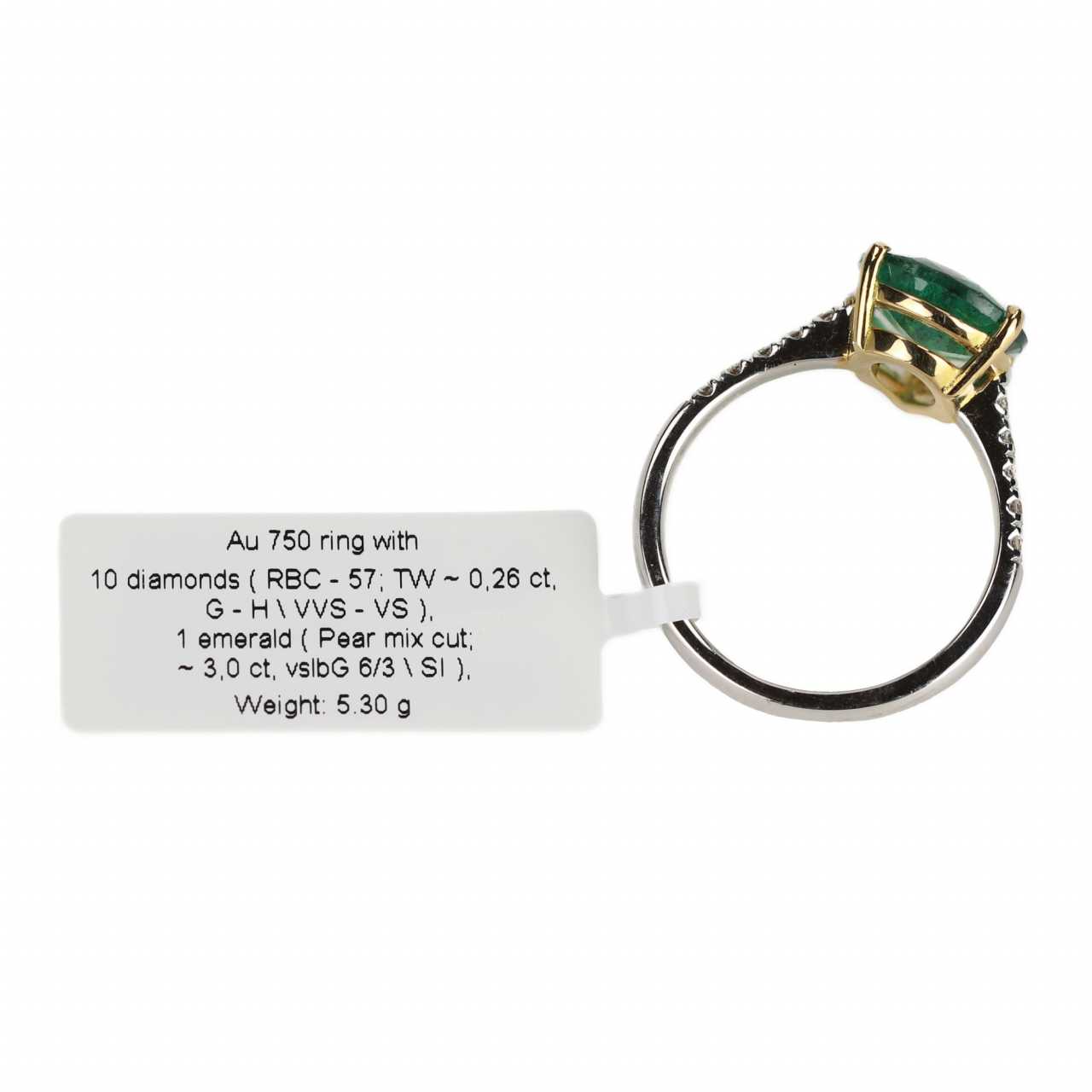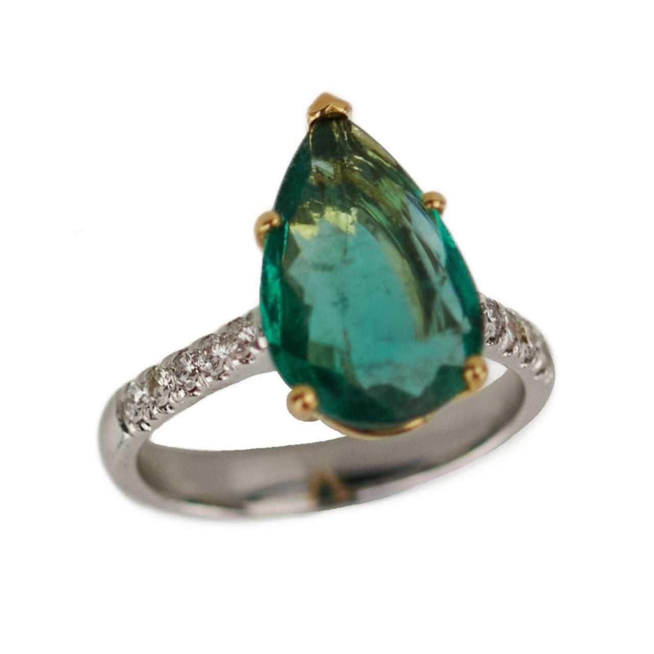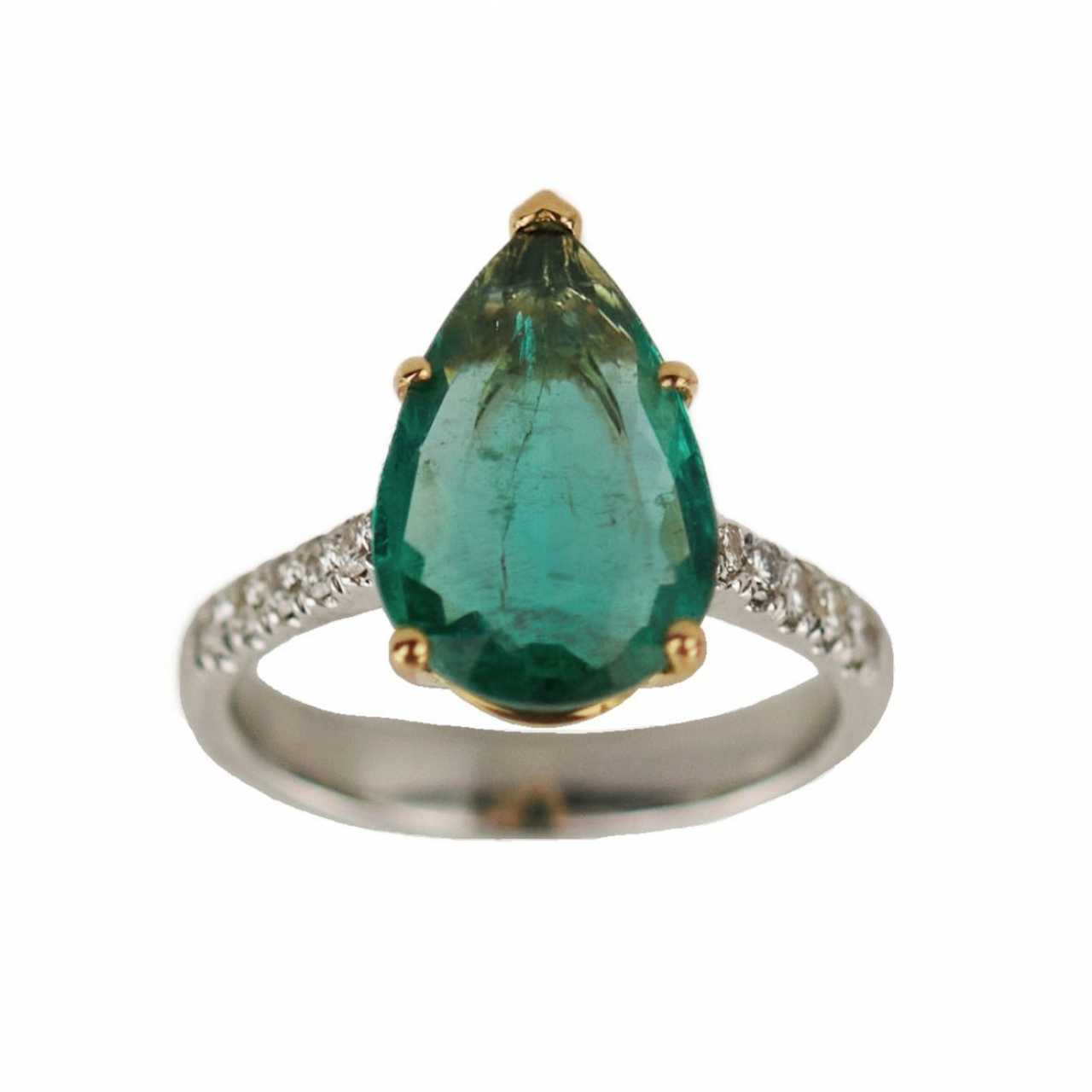 Золотое 18 К кольцо с изумрудом весом 3 карата каплевидной формы и 10 бриллиантами весом 0,26 карат. Размер колца:17. Вес: 5,30 гр.