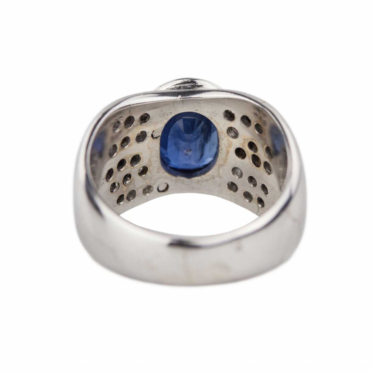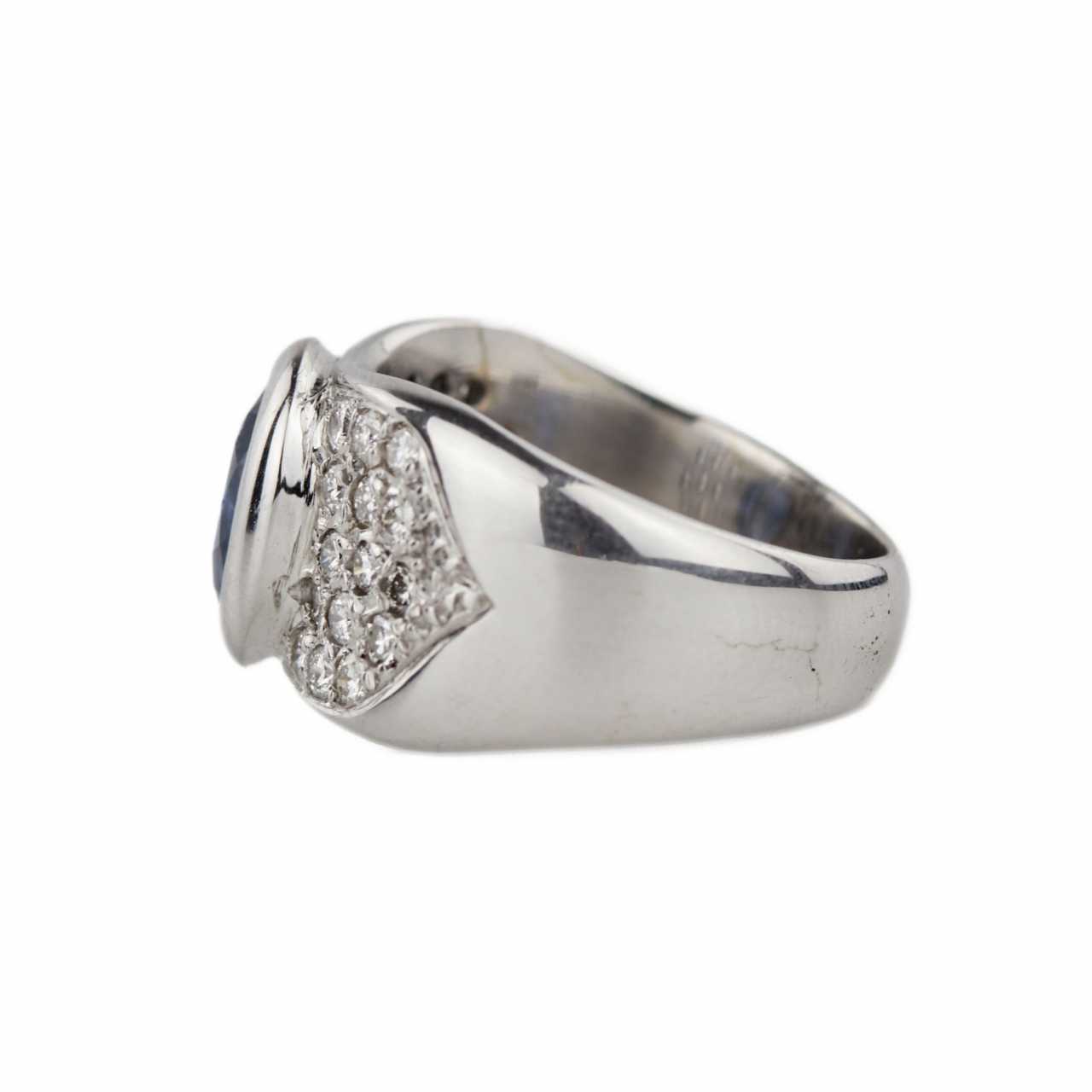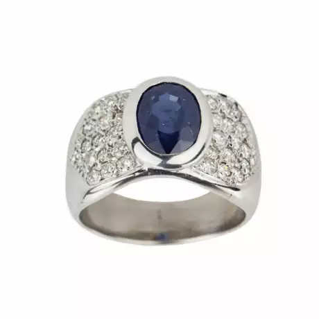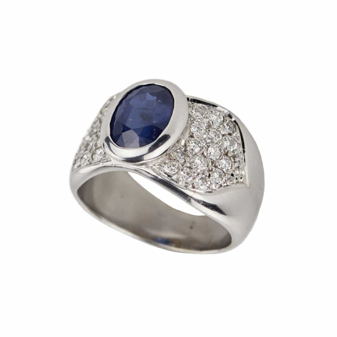Золотое кольцо 18 к, с сапфиром и бриллиантами. Овальный сапфир: 3 карата.H12(11). 30 бриллиантов 0,80 карат. G-H-SI. Размер кольца:18. Вес: 14,13 гр.