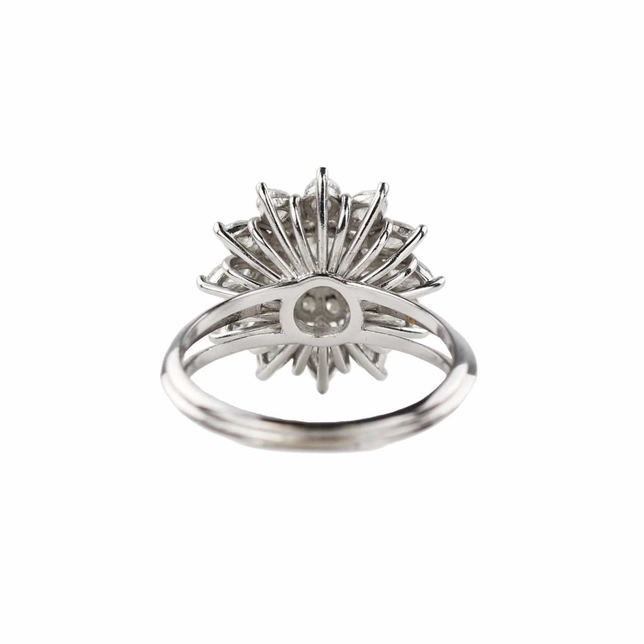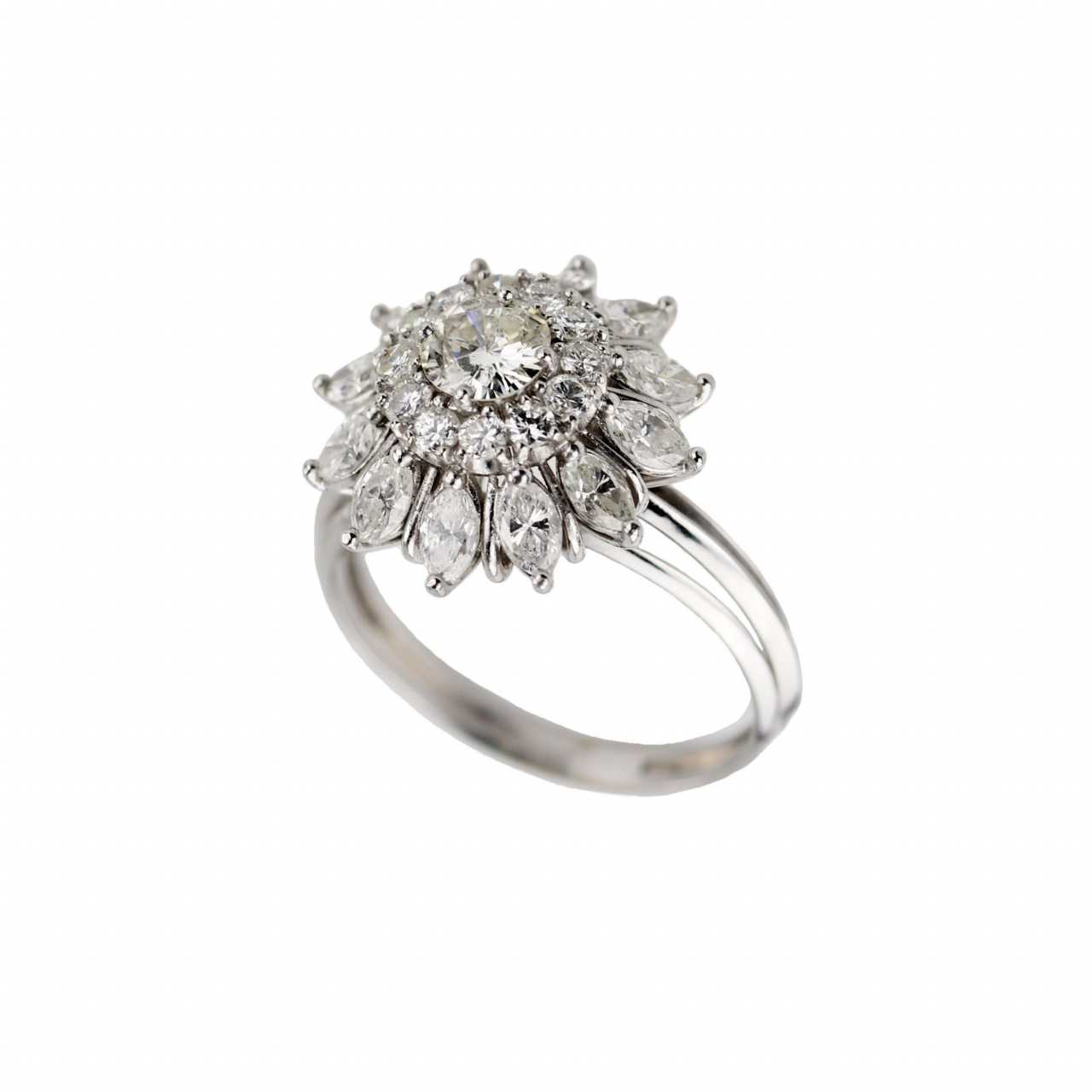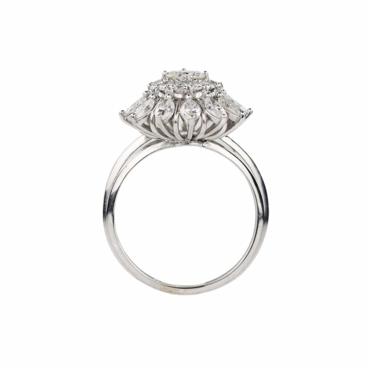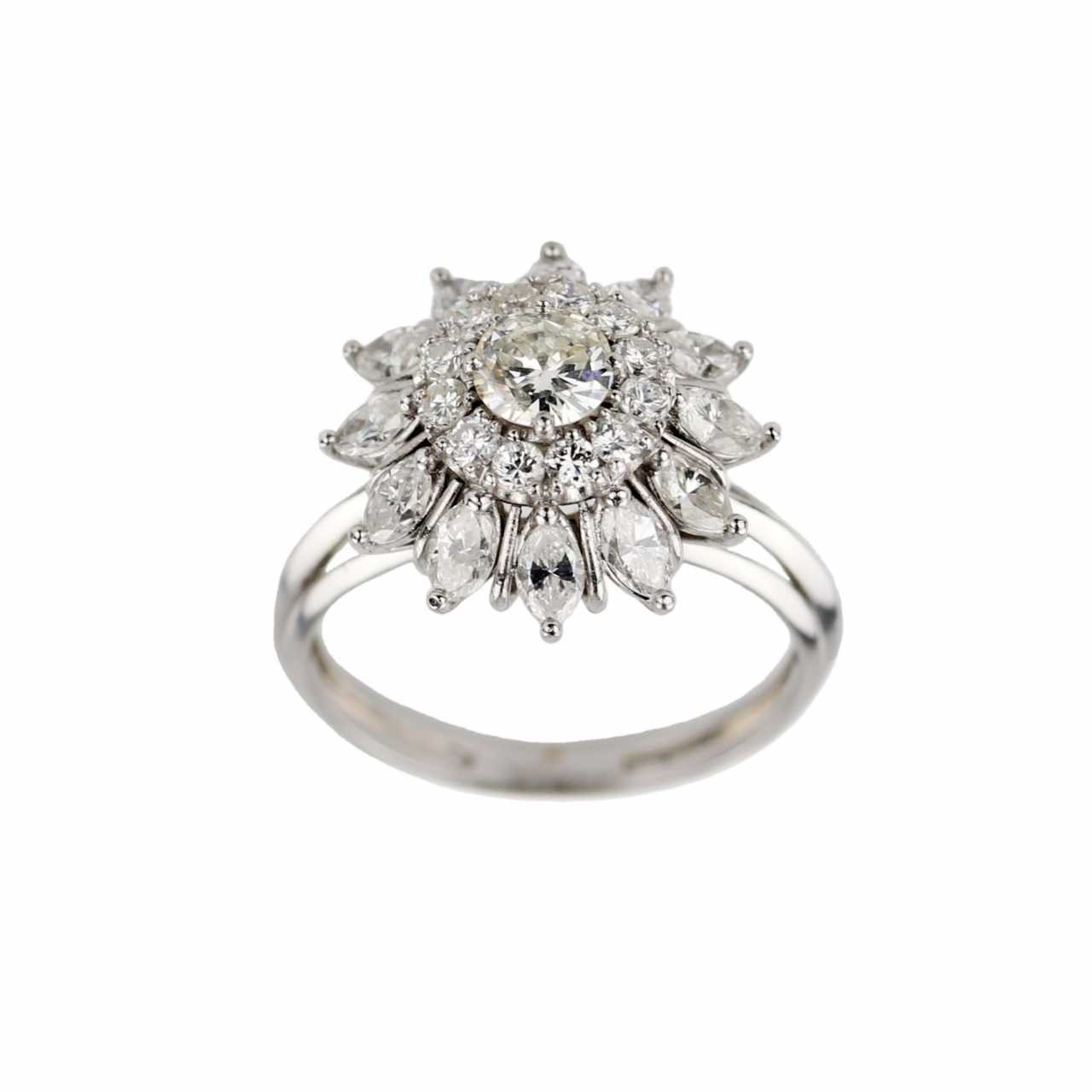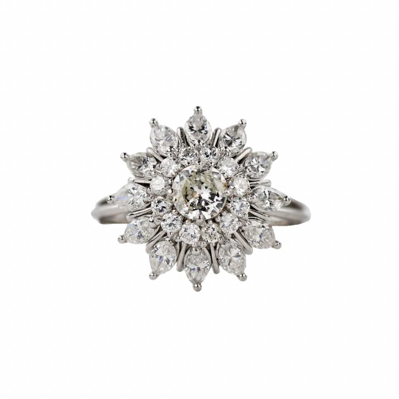Кольцо белого золота с бриллиантами. Центральный камень 0.5 карат, Ii. 2 круглый бриллиантов 0.42 карата. VS-SI. 12 бриллиантов маркизов 1,1 карат, VS-SI. Вес: 6,77 гр.Сертификат латвийской пробирной палаты: 3-9-6472022.