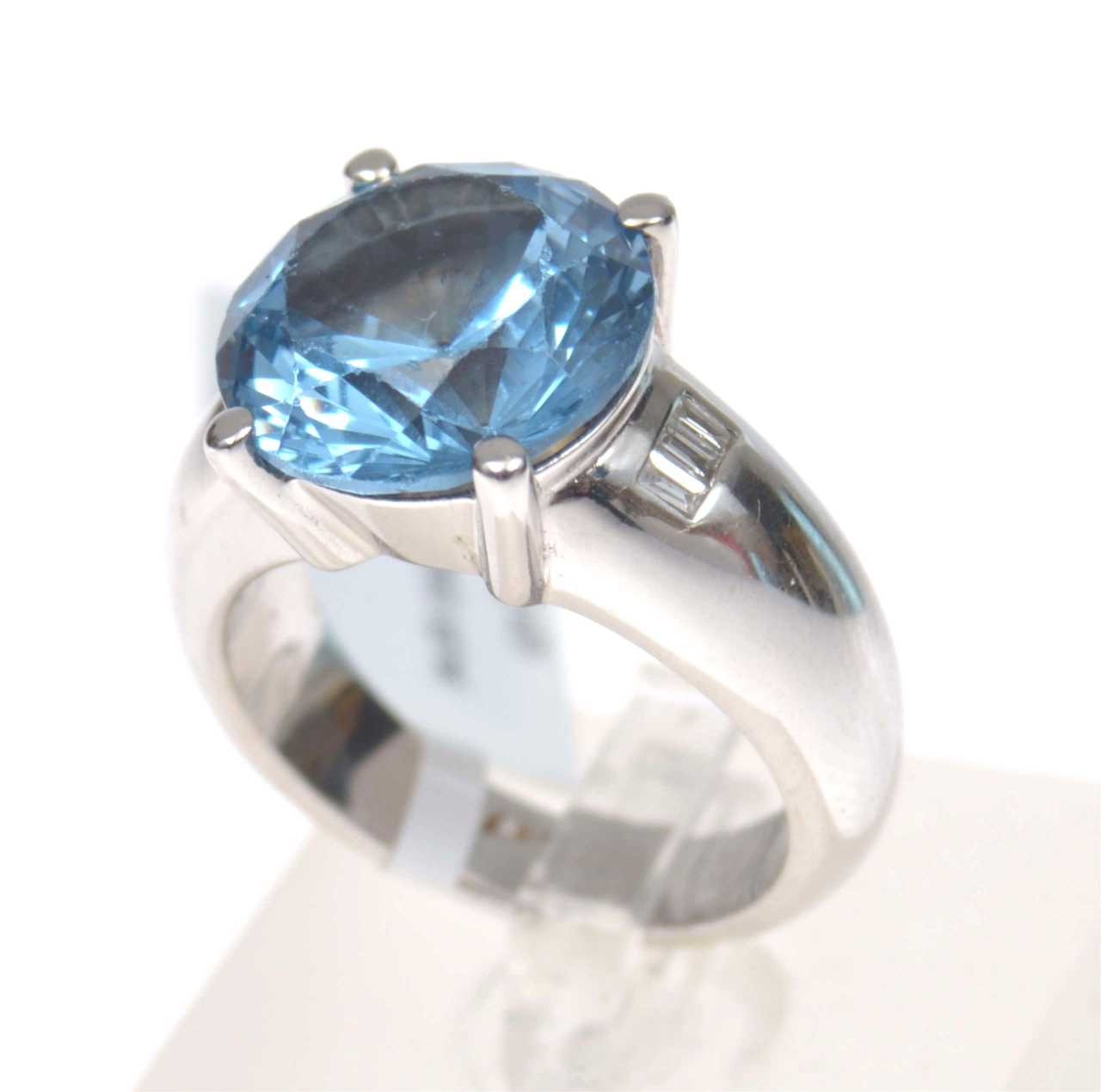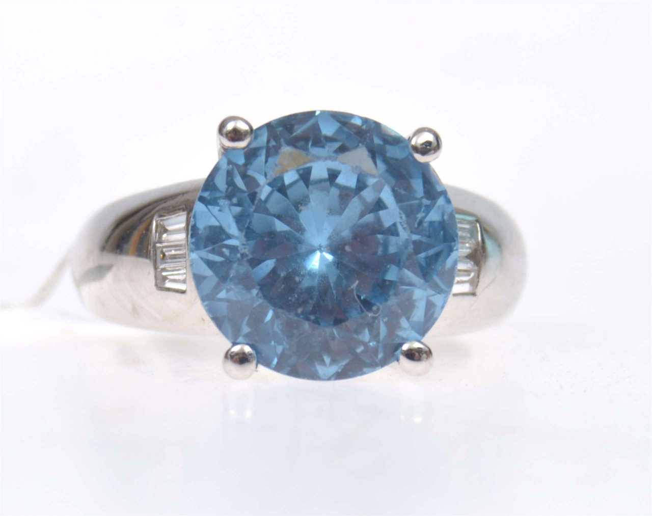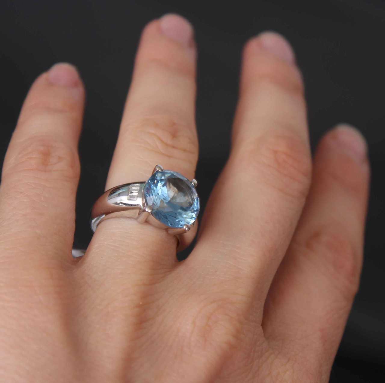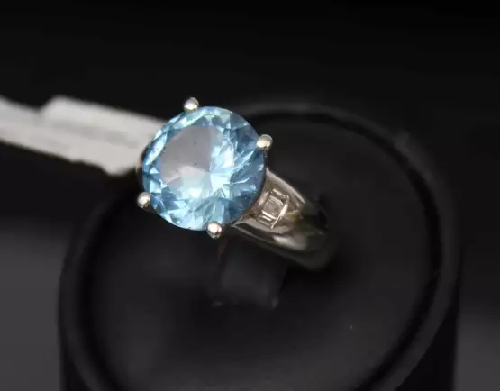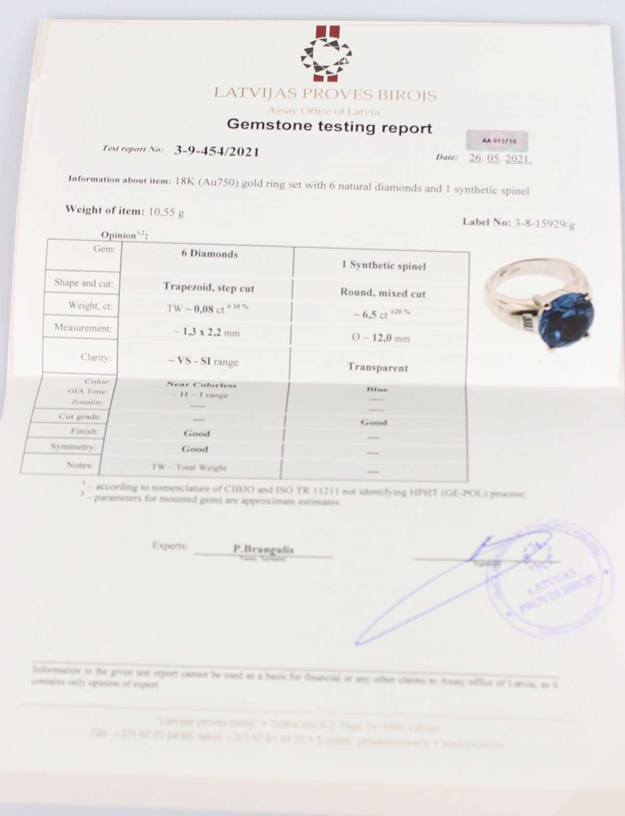 Золото 750 проба, Золото 18К, 750-я проба, 6 натуральных бриллиантов (0,08 карат, 1,3х2,2 мм, VS-SI; 1 синтетическая шпинель 6,5 карат, 12,0 мм, 1 синтетическая шпинель. Вес 10,55 г, внутренний диаметр 17 мм. С сертификатом.
