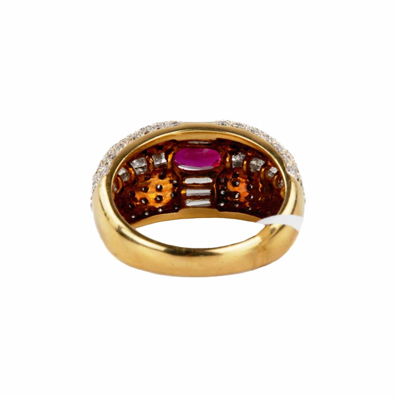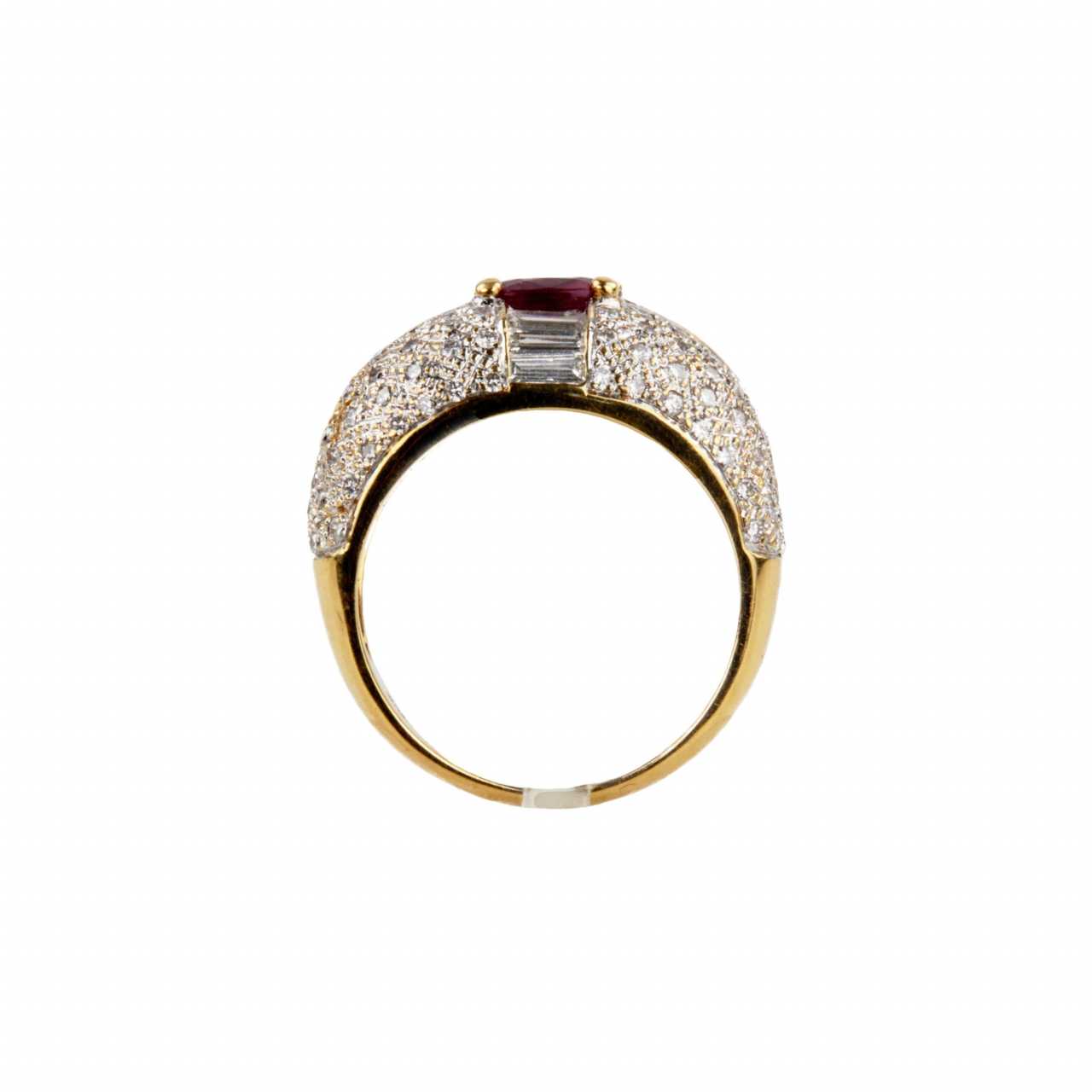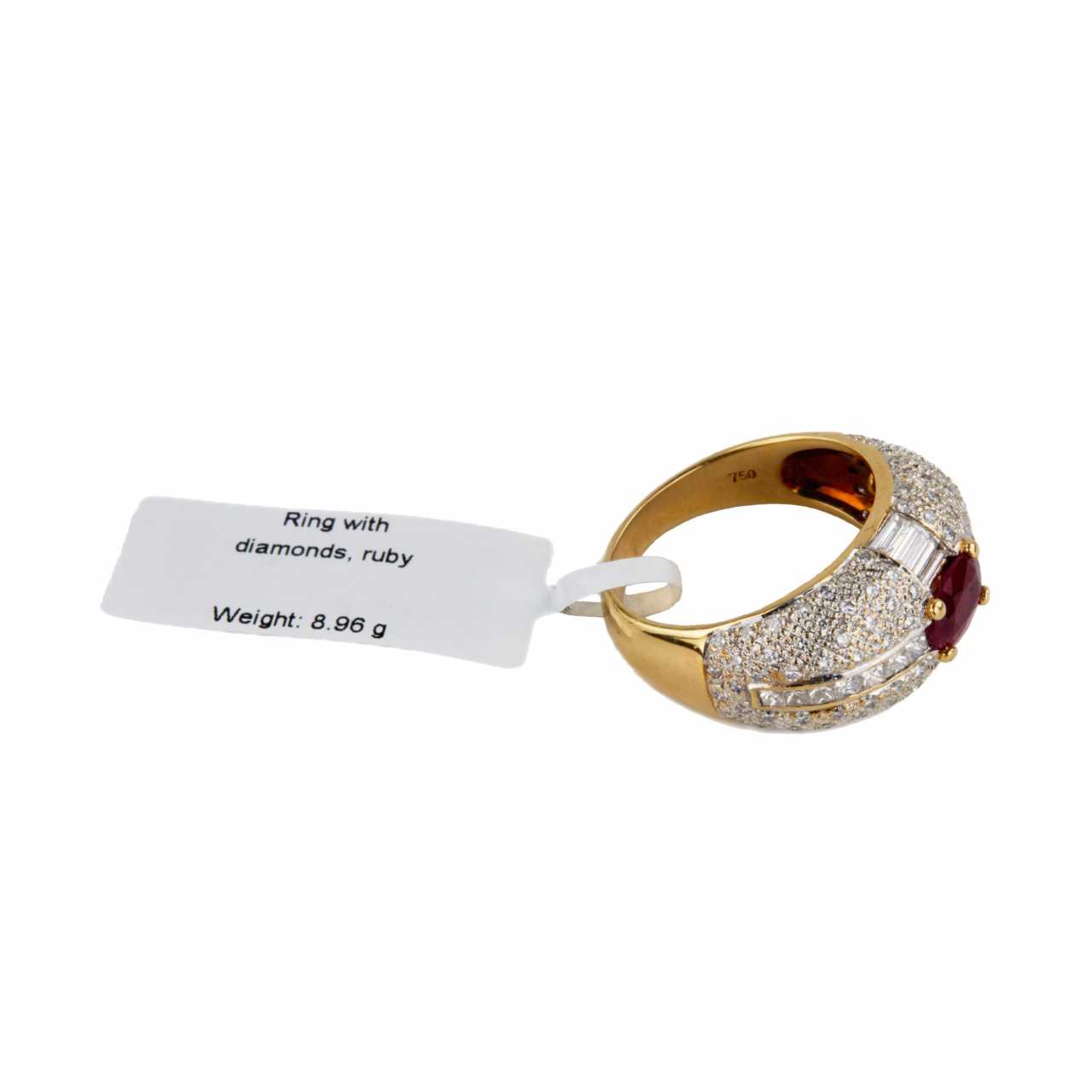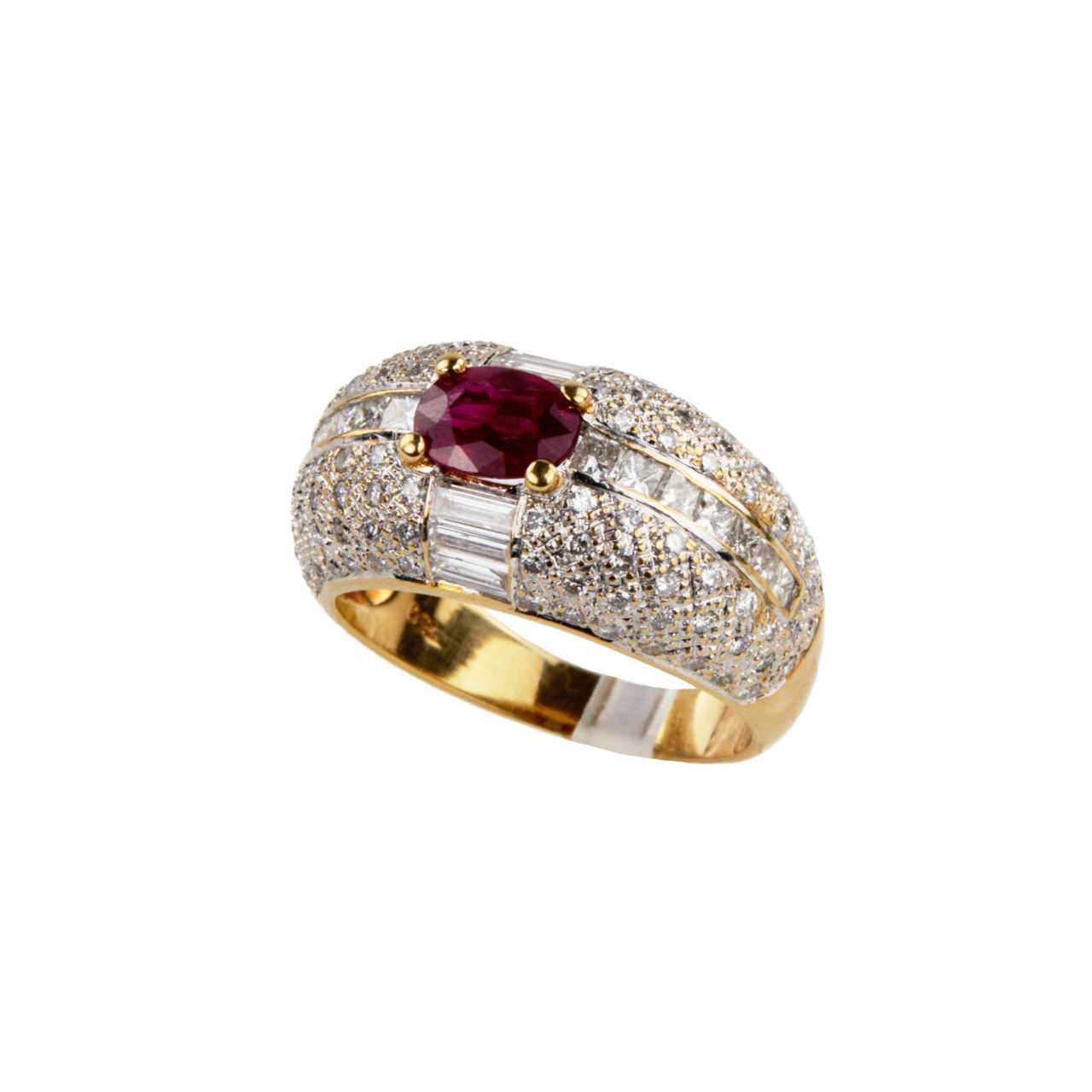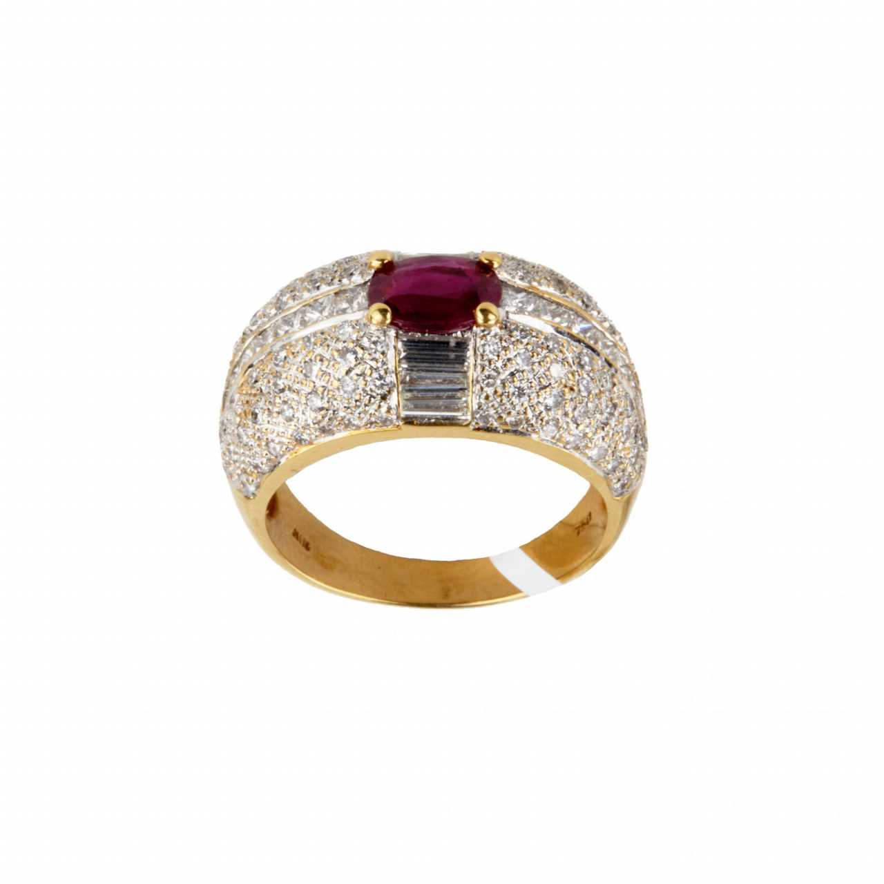 Золотое кольцо 750 пробы с рубином и бриллиантами. 126 бриллиантов - 1.4 карат. Рубин - 0.9 карат.Вес: 8.96 гр. Сертификат латвийской пробирной палаты: 3-9-5932021.