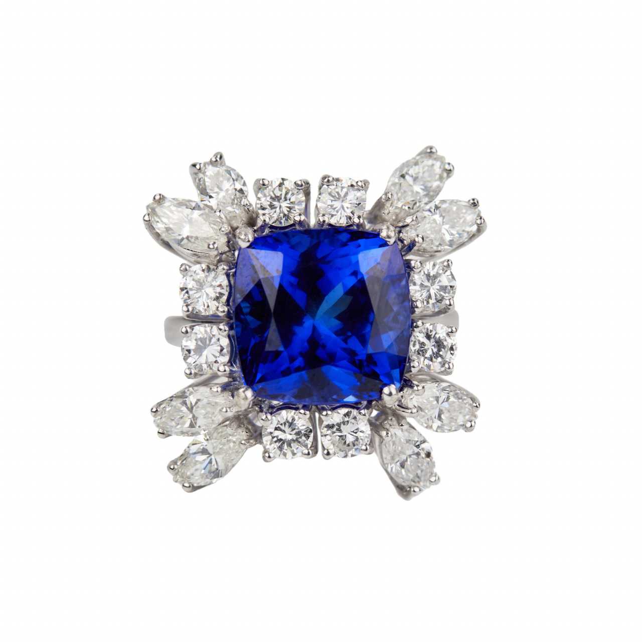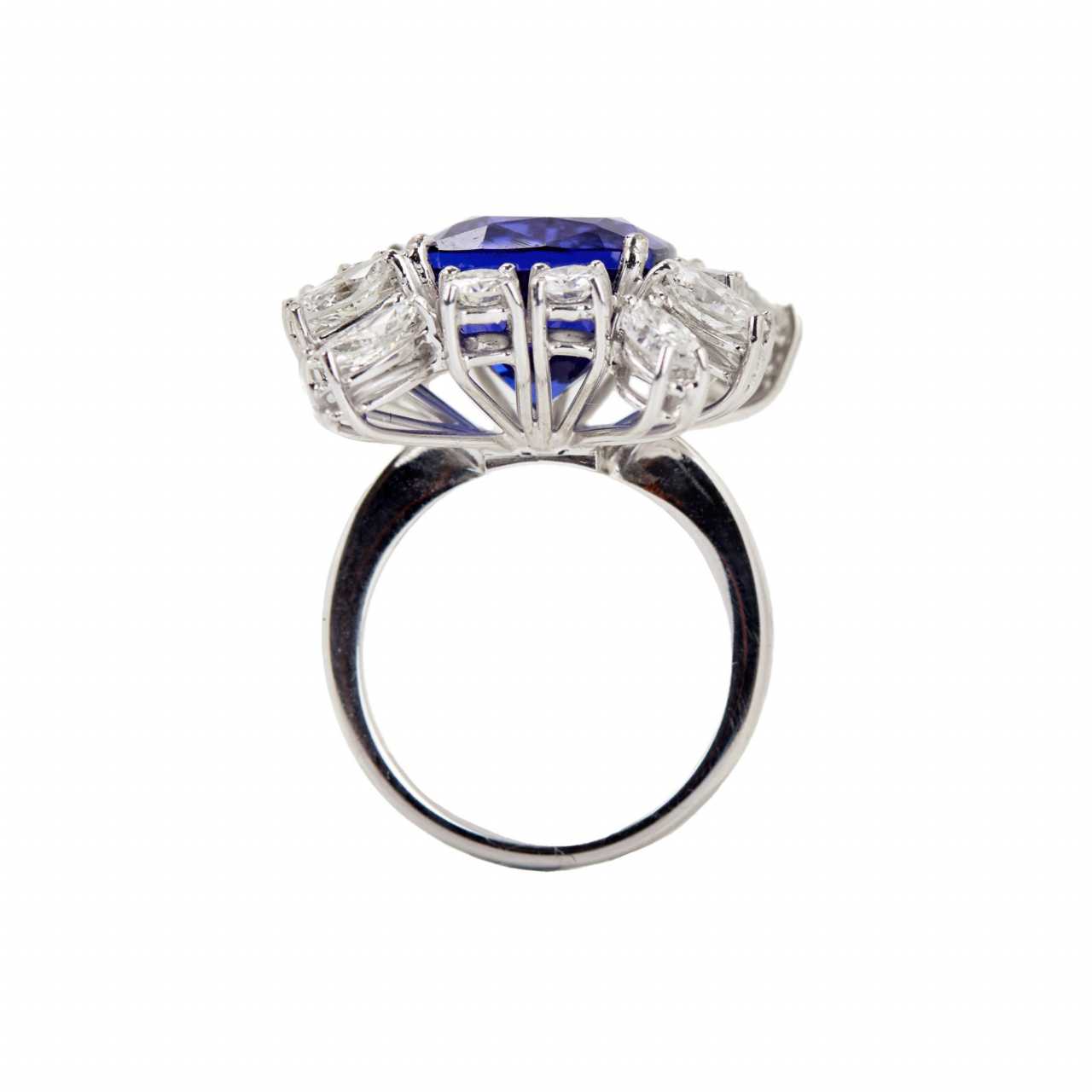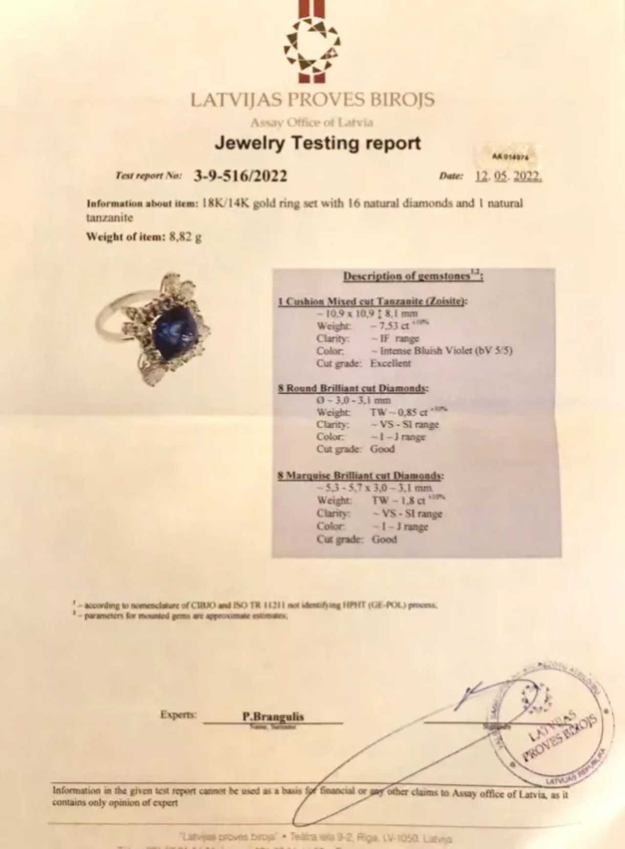 Яркое, золотое кольцо с танзанитом и бриллиантами. Танзанит: 7,53 карата. 8 круглых бриллиантов 0,85 карат VS-SI. Бриллианты маркизы 1,8 карат VS-SI. Вес кольца: 8,82 гр. Латвийский сертификат пробирной палаты 3-9-5162022.