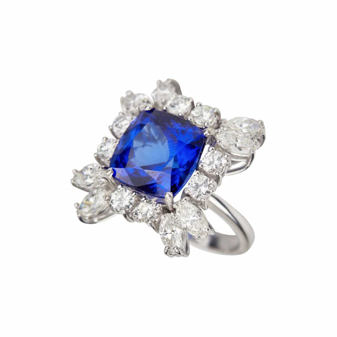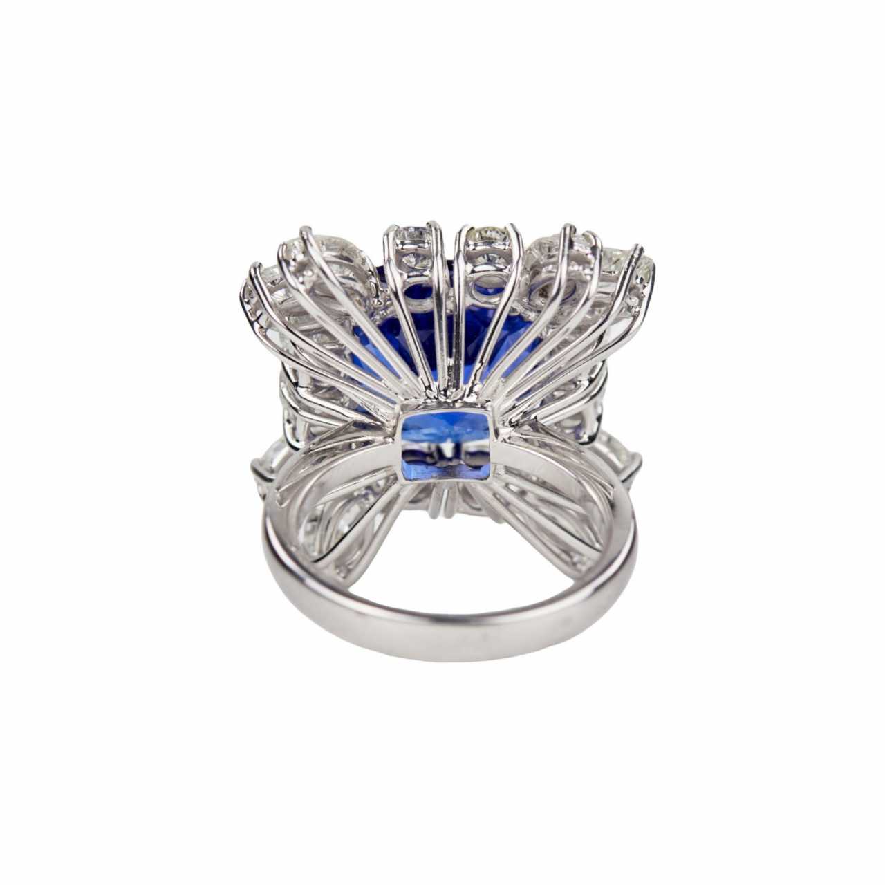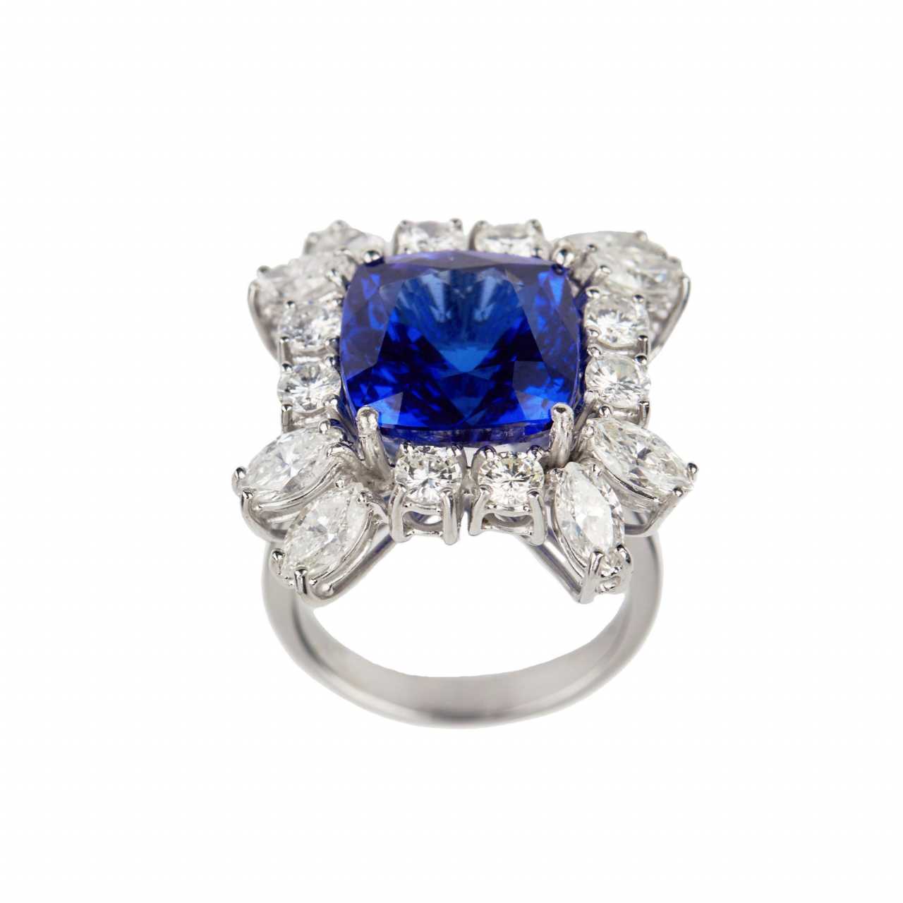 Яркое, золотое кольцо с танзанитом и бриллиантами. Танзанит: 7,53 карата. 8 круглых бриллиантов 0,85 карат VS-SI. Бриллианты маркизы 1,8 карат VS-SI. Вес кольца: 8,82 гр. Латвийский сертификат пробирной палаты 3-9-5162022.