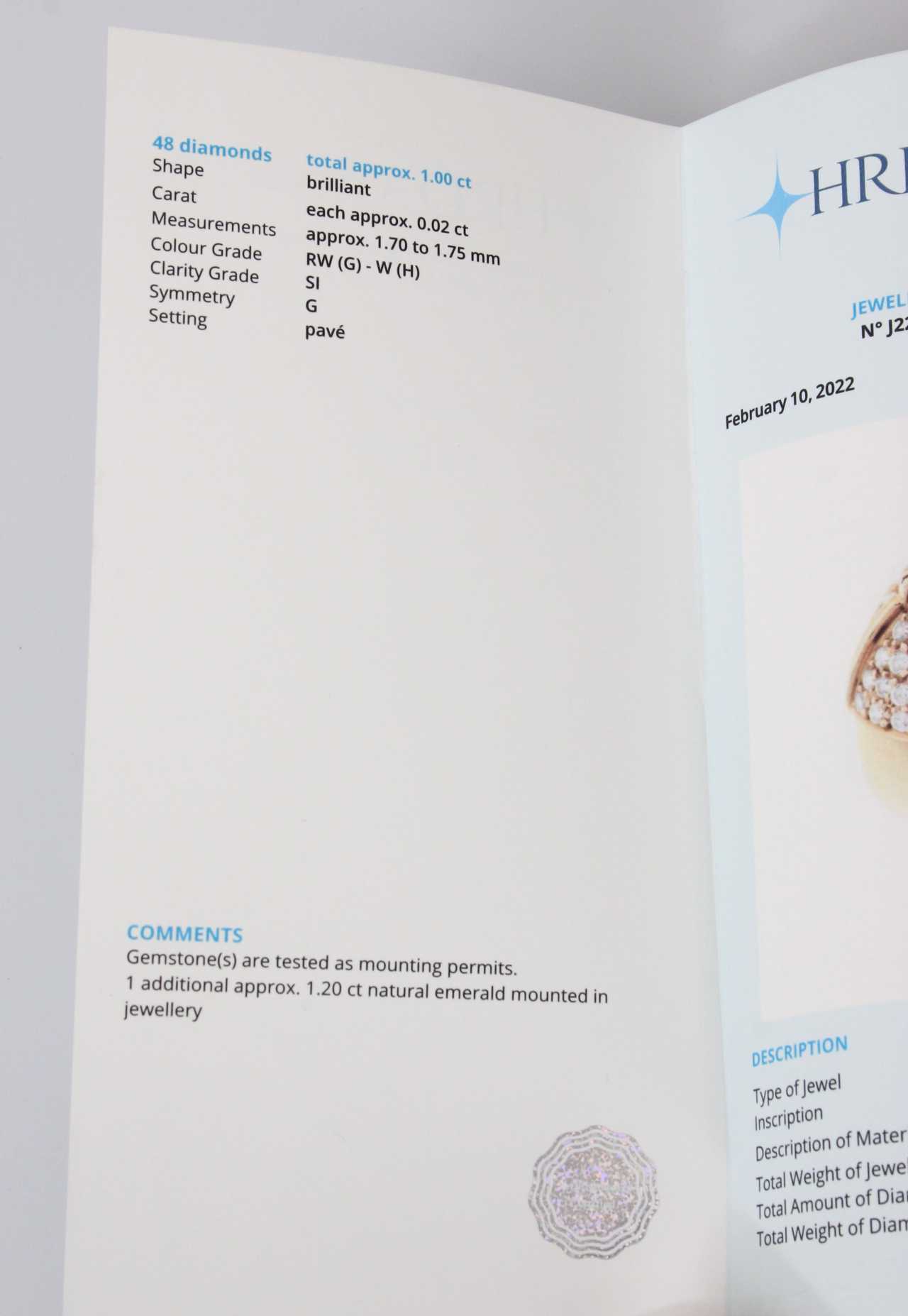 21-го века. Золото, 18 карат, 48 бриллиантов - 1 карат, каждый ок. 0,02 карата, от 1,70 до 1,75 мм, RW(G)-W(H), SI, G; изумруд – 1,20 карат. Вес 8,10 г, внутренний диаметр 16,87 мм. С сертификатом
