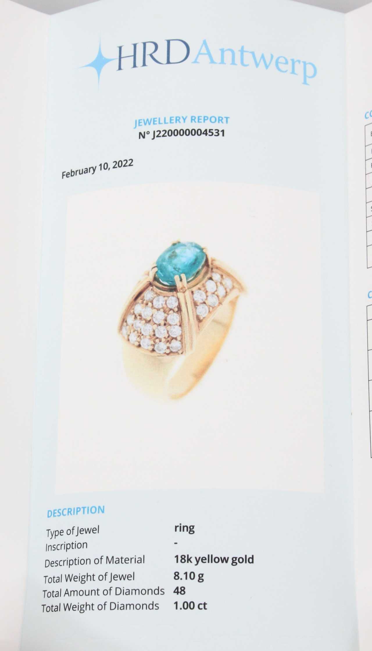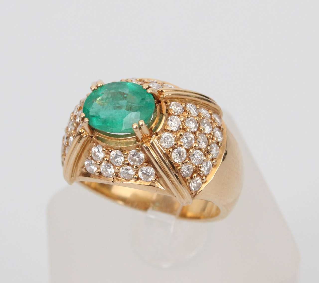 21-го века. Золото, 18 карат, 48 бриллиантов - 1 карат, каждый ок. 0,02 карата, от 1,70 до 1,75 мм, RW(G)-W(H), SI, G; изумруд – 1,20 карат. Вес 8,10 г, внутренний диаметр 16,87 мм. С сертификатом