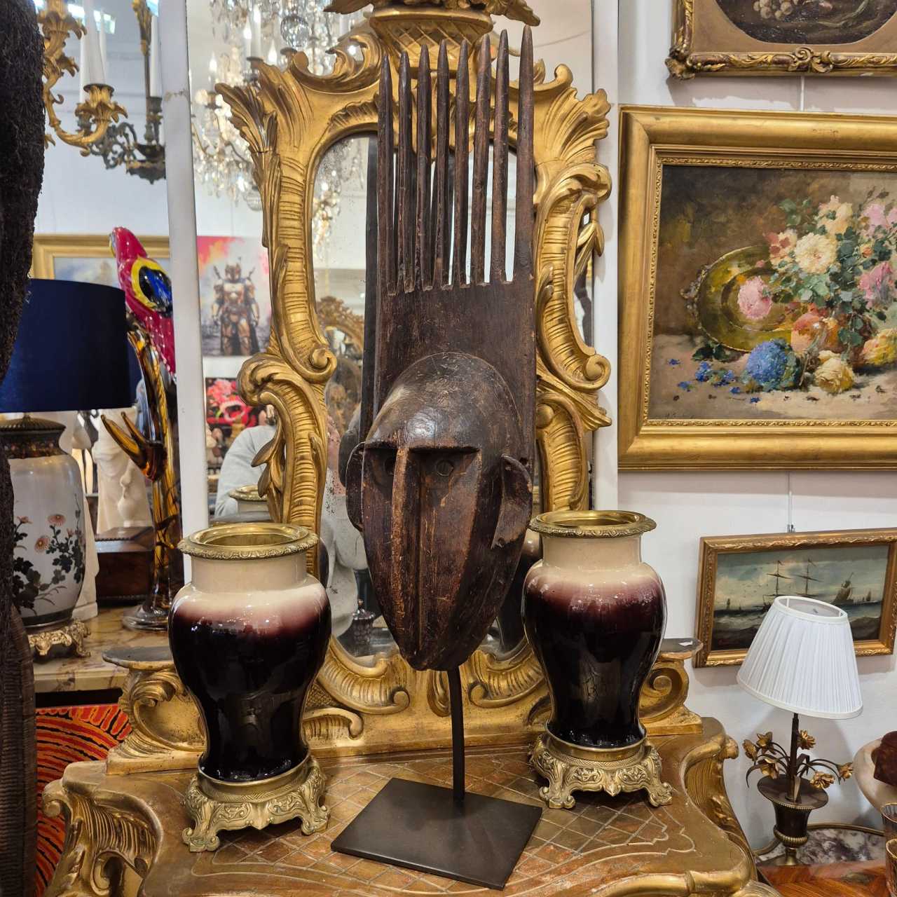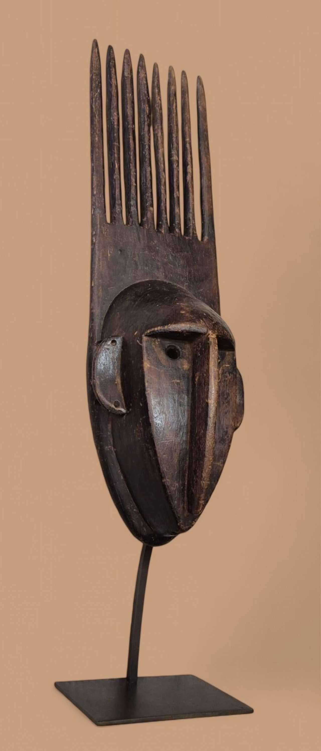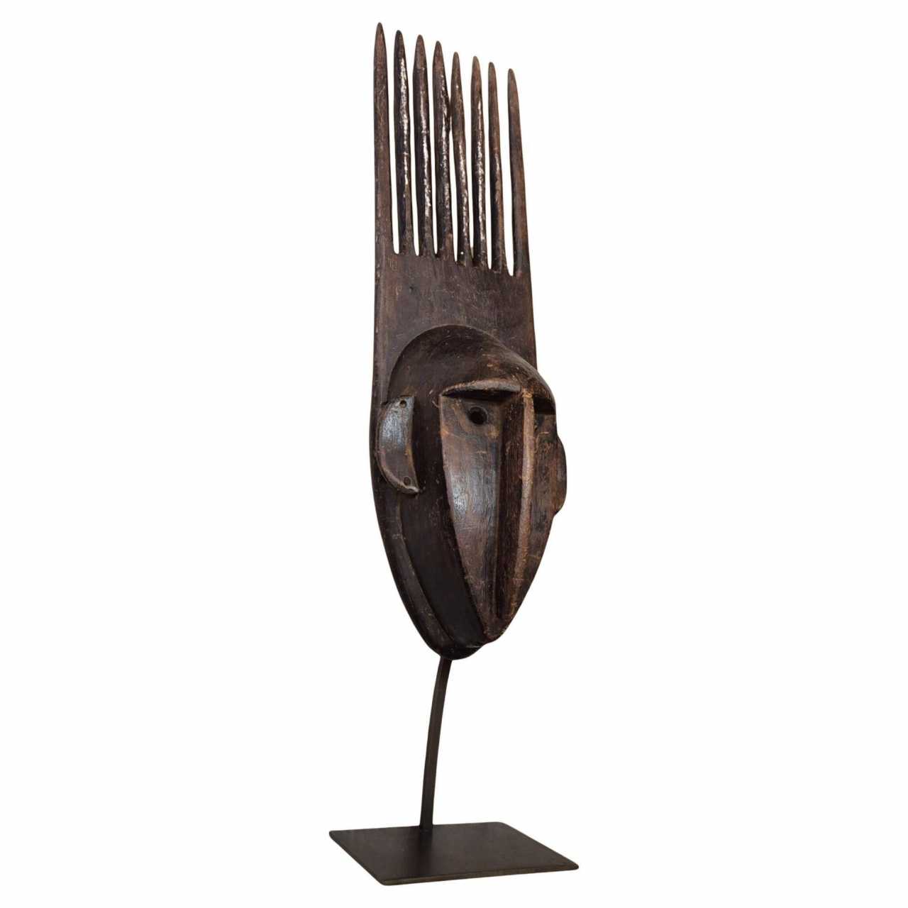 Bamana Ntomo mask, Mali, 20th centuryGenerally surmounted by three to eight horns forming a comb, the Ntomoface mask refers to a moment of compulsory education given to uncircumcised young boys in certain West African societies. The masks discreet, even absent, mouth emphasizes the behavior expected of them in their future adult life after training: controlling and measuring their words, knowing how to keep quiet, preserving secrets and enduring pain in silence.Excerpt from Masques du Ntomo, Marc Ladreit de Lacharrière Collection, Musée du Quai Branly Jacques Chirac, France.The Bambara, or Bamana, live in central and southern Mali. Their name means “unbeliever” and was given to them by the Muslims. Animists, they believe in the existence of a creator god called Ngala, who maintains the order of the universe and coexists with another androgynous god called Faro, master of the Word, who gave all qualities to mankind and makes the fruits of the earth grow. Traditional Bamana art objects are closely linked to agrarian rites.The Bamana dance these masks during initiation and circumcision ceremonies for young boys in the Ntomo society. The face, with its vertical outgrowths at the top, adopts geometric features beneath a rounded forehead, including an imposing busted nose, as the Bamana favor this organ in their statuary as it evokes sociability and clan cohesion. Indeed, during choreography, the dancer frequently touches the nose of the mask.As teaching aids for candidates, masks from societies accessible to young boys and adults, such as the Ntomo, Korè and Ci wara, appeared not only during initiation reclusion, but also at village entertainments.This Ntomo mask, dating from the mid-20th century, is highly graphic and stylized in design, with all the characteristics of Bamana initiation masks and a beautiful oiled brown patina.