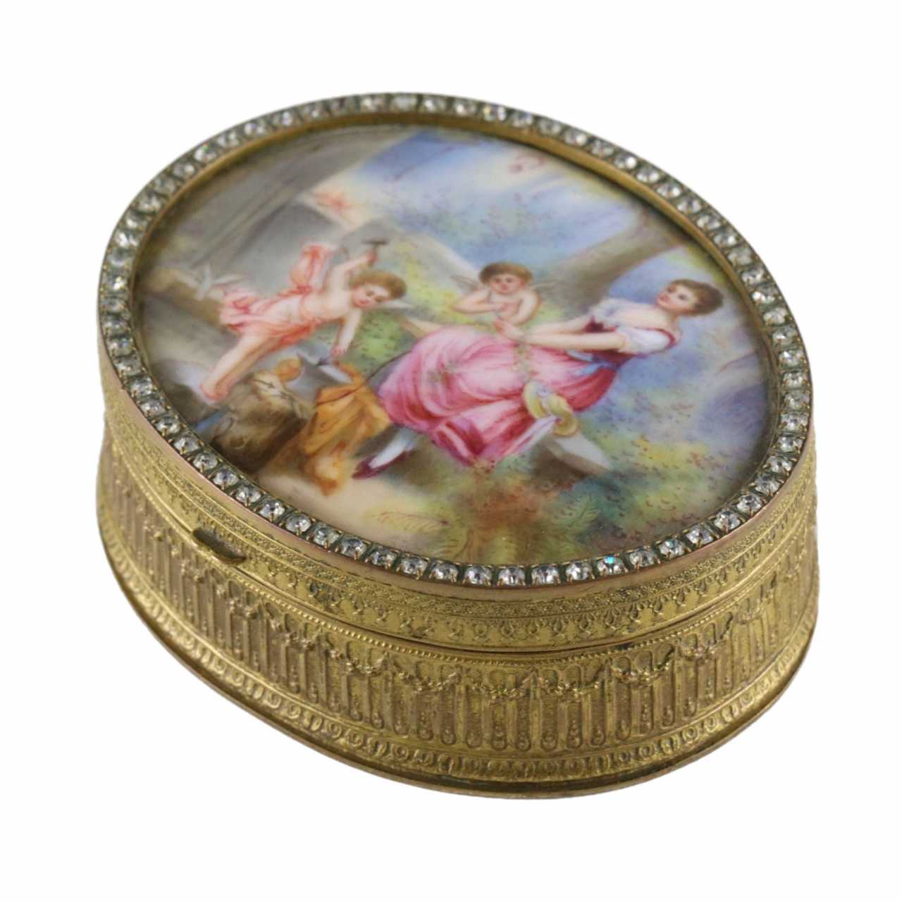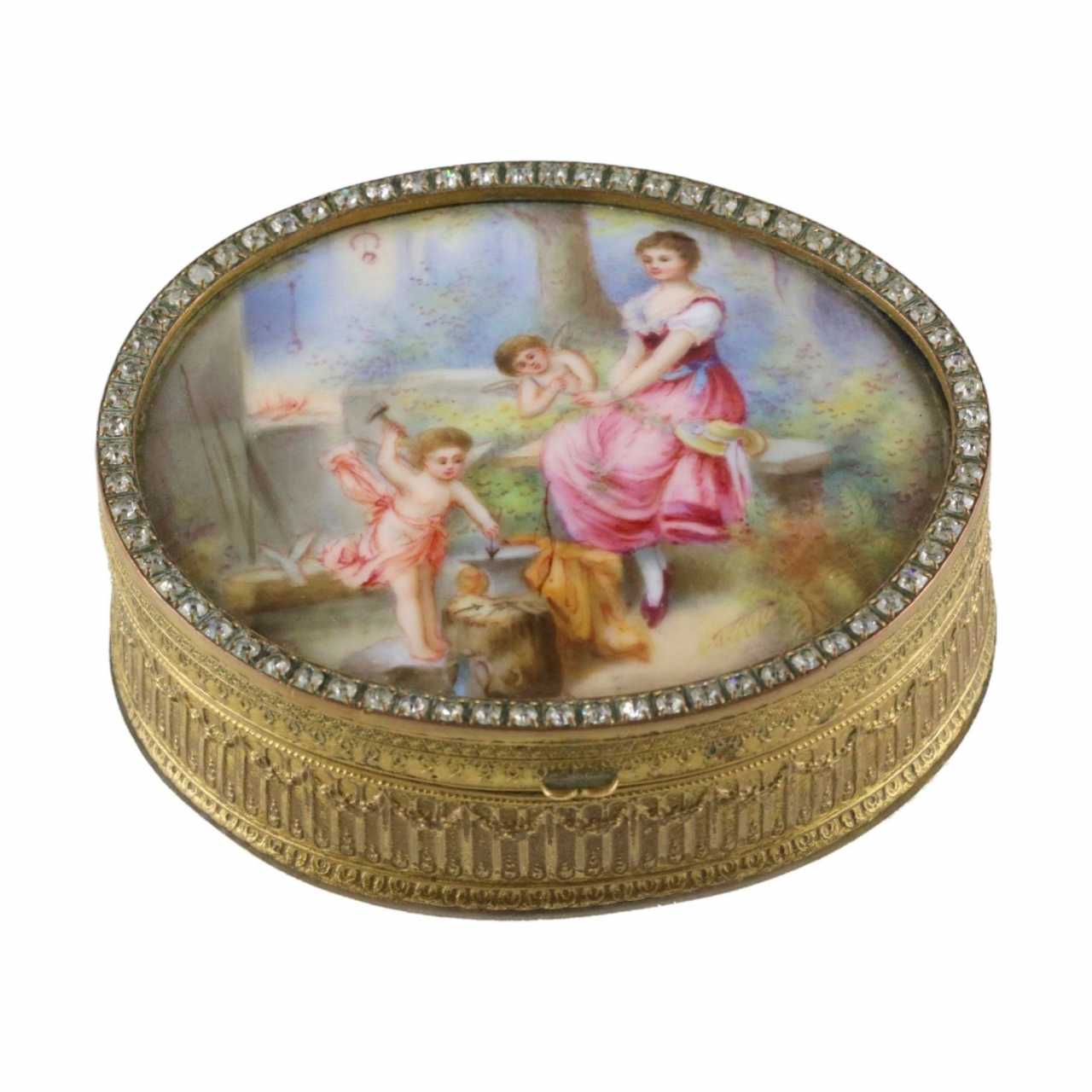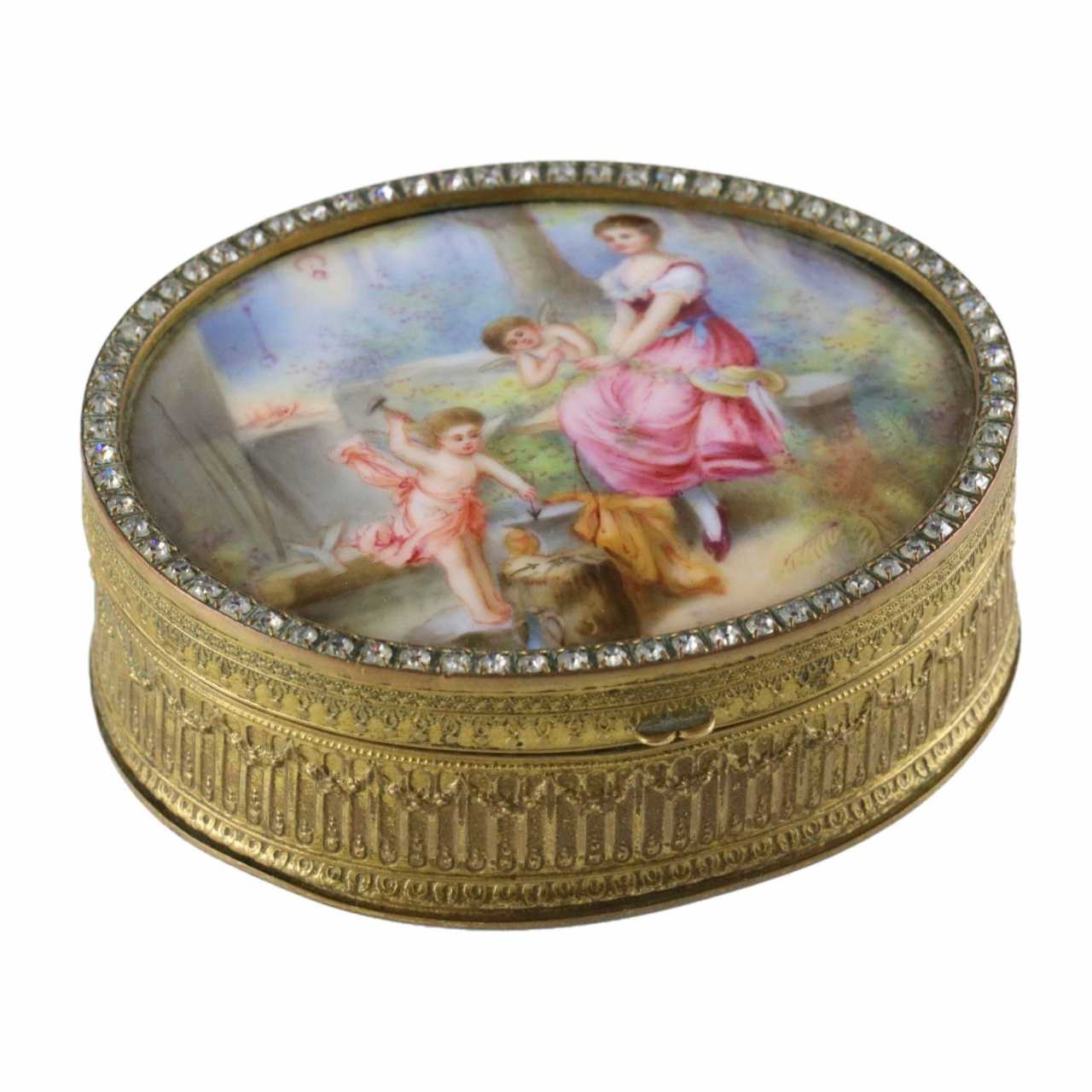 Овальная шкатулка для украшений позолоченной бронзы, с фарфоровой миниатюрой изготовления стрел, на крышке в обрамлении камней. Изображает купидонов кующихисправляющих стрелы для барышни.Кому адресованы стрелы: молодому человеку, что будет прикован к девушке, или же для нее самой для возбуждения непреклонного сердца - решать зрителю, владельцу шкатулки. 9х7,5см.