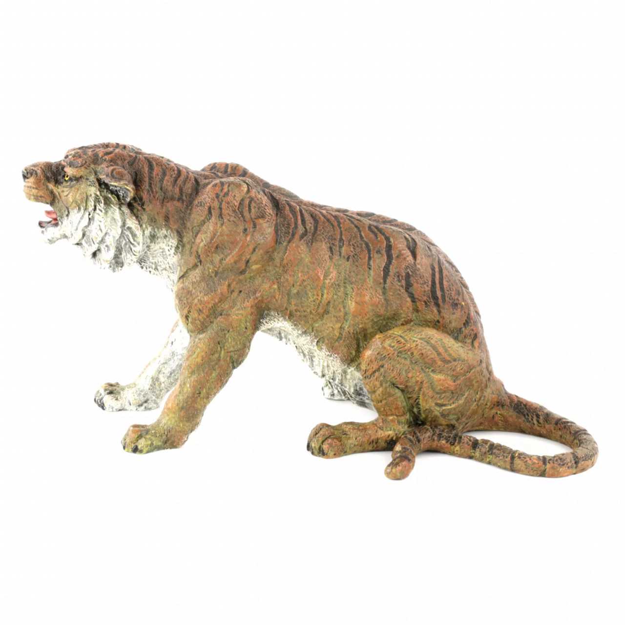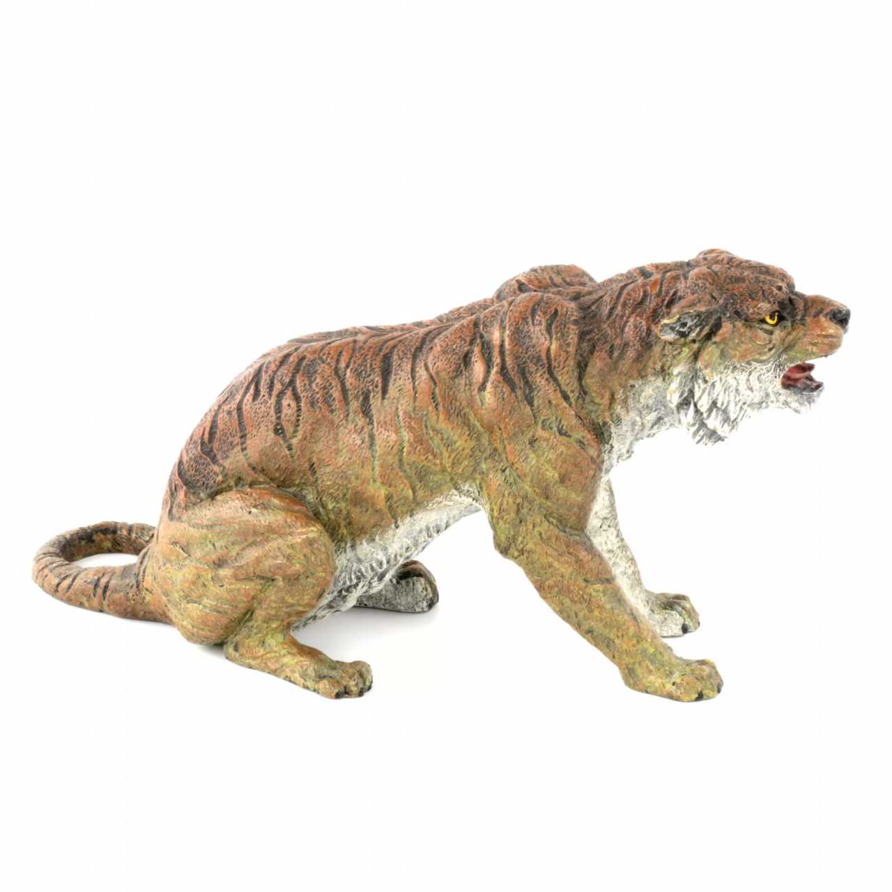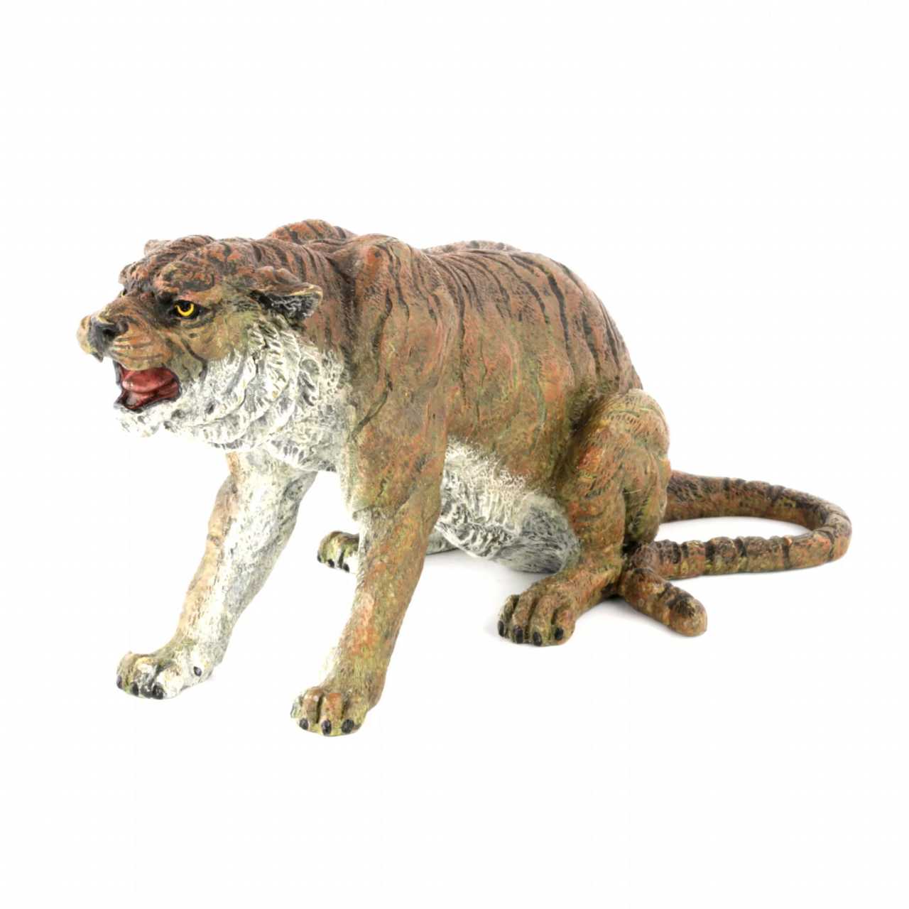 Расписная венская бронза Тигр. С детальной точностью изображает сидящее, оскалившееся животное. Литьё. Роспись по бронзе. На животе тигра клеймо фабрики Бергмана, В в кувшине и Austrija. Прекрасный подарок в наступающий 2022 год Тигра по восточному календарю.