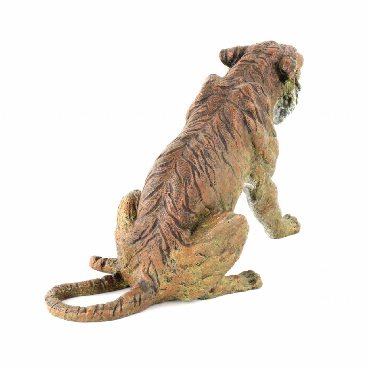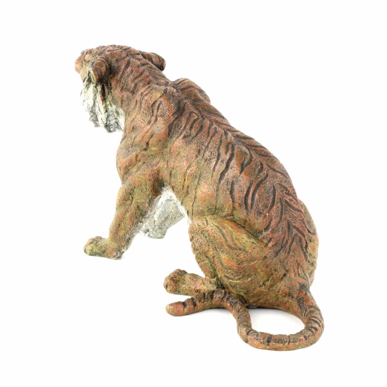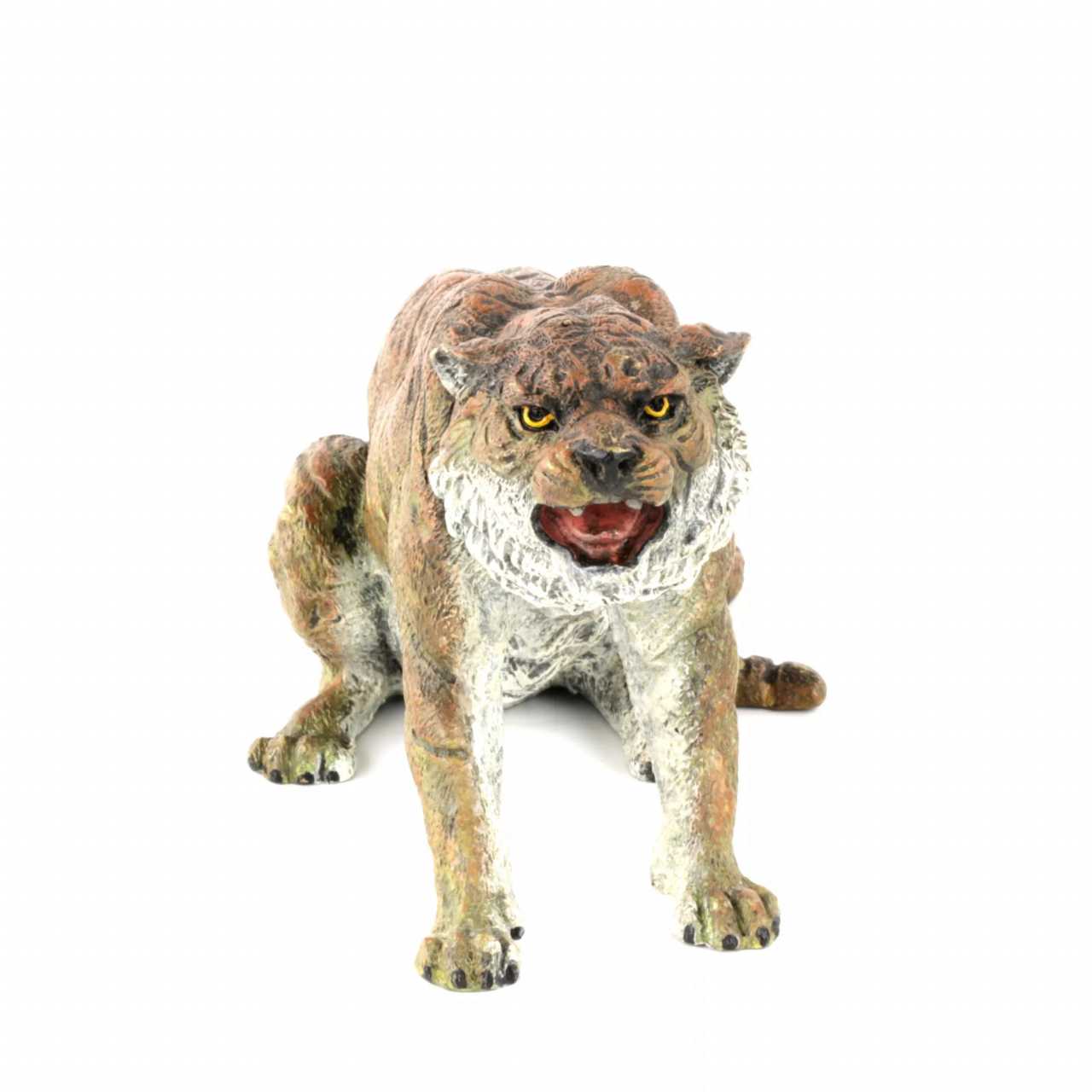 Расписная венская бронза Тигр. С детальной точностью изображает сидящее, оскалившееся животное. Литьё. Роспись по бронзе. На животе тигра клеймо фабрики Бергмана, В в кувшине и Austrija. Прекрасный подарок в наступающий 2022 год Тигра по восточному календарю.