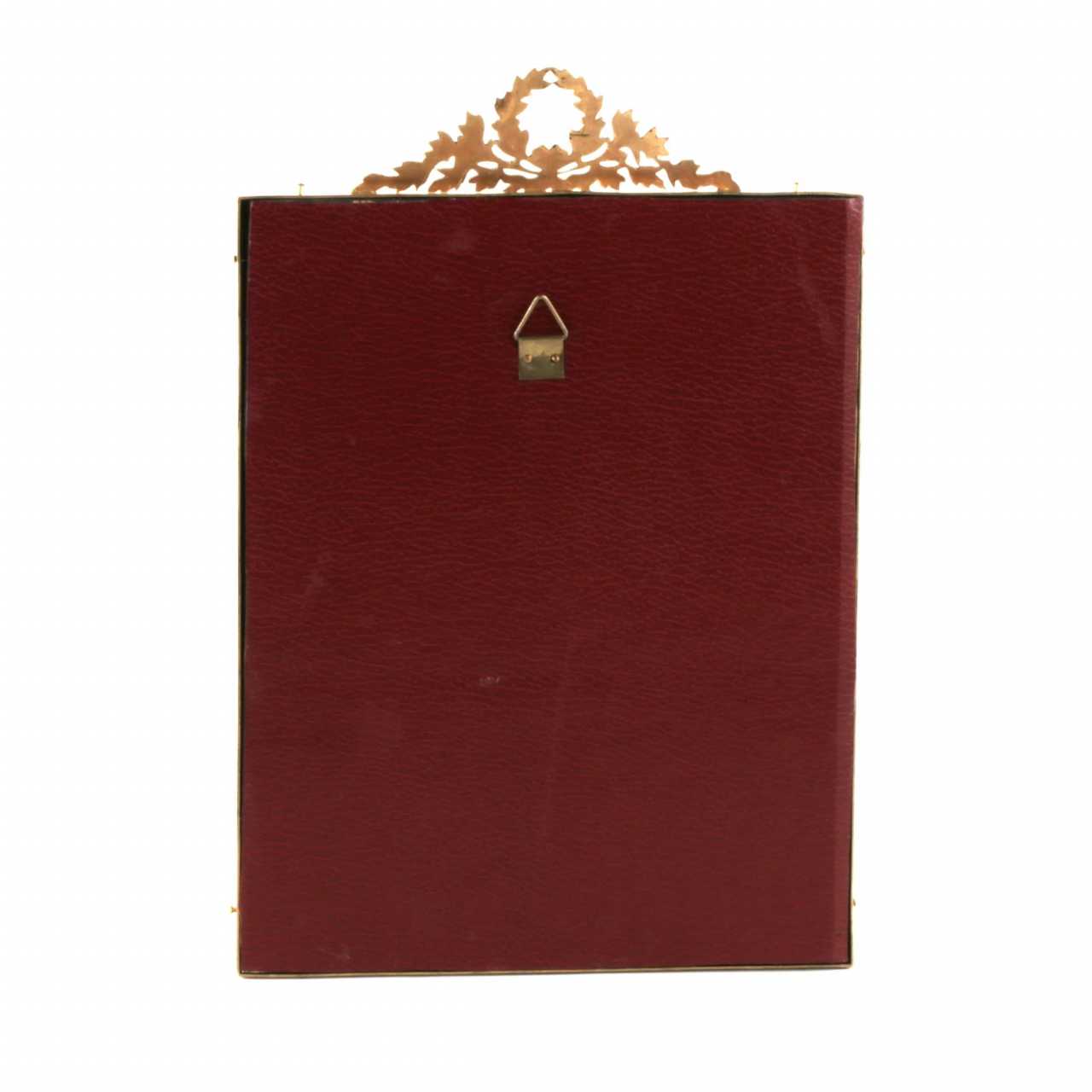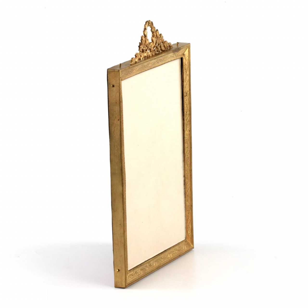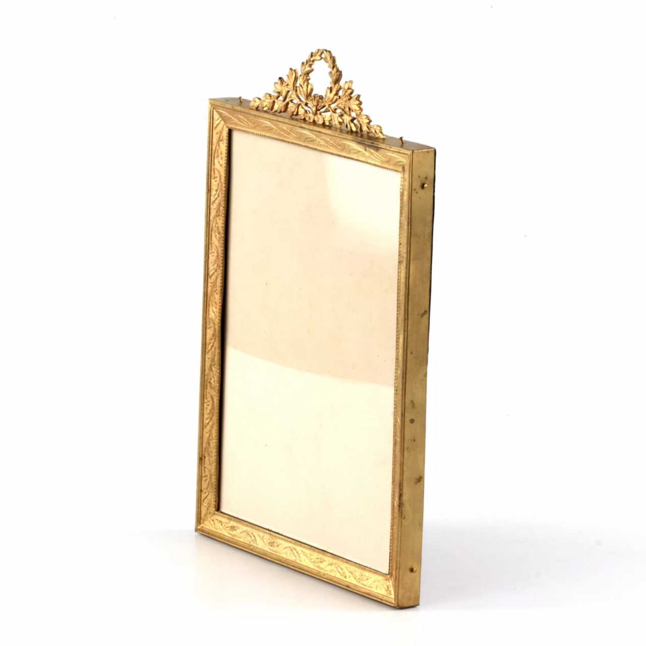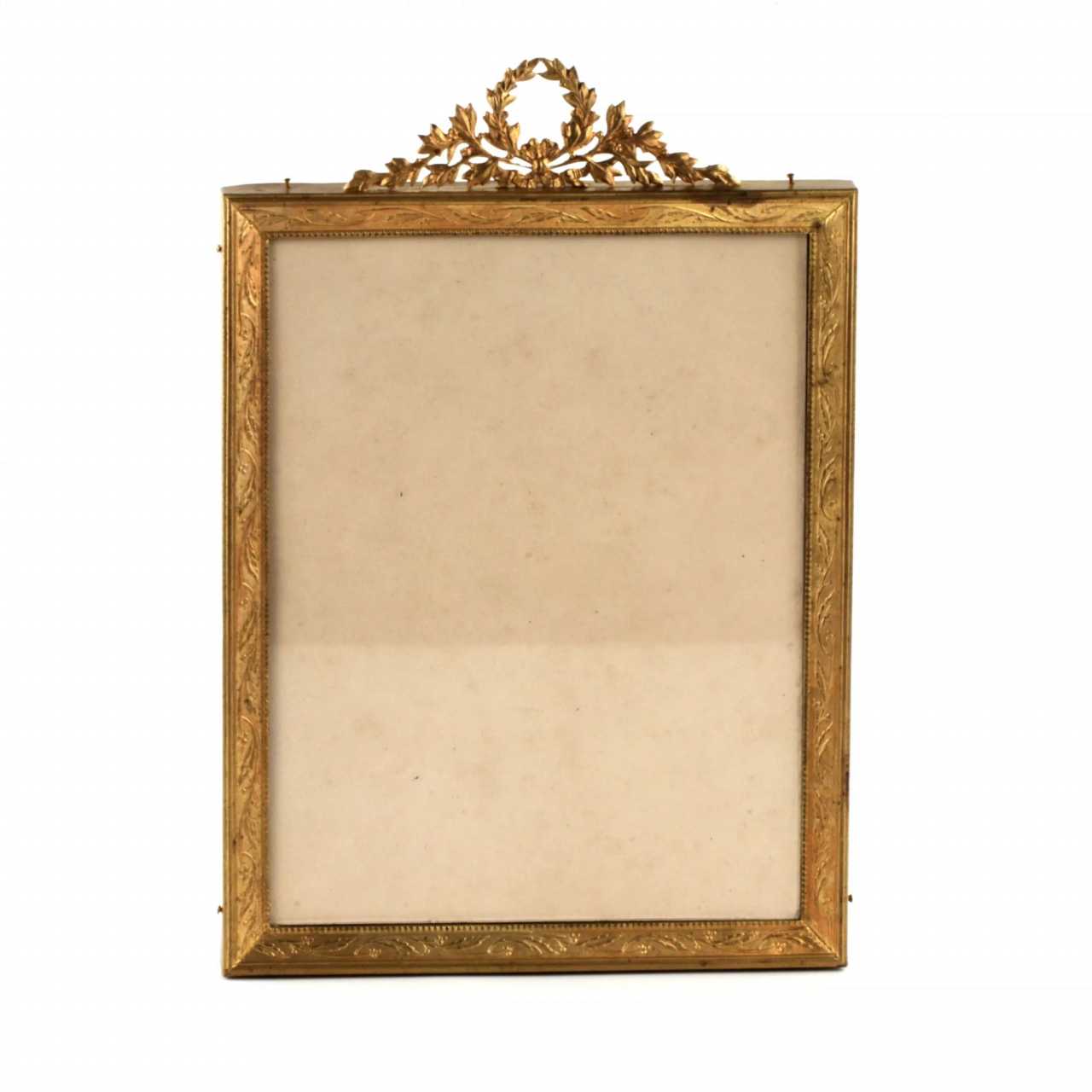 Латунная, позолоченная рамка для фотографий, сочетающая ампирный венок и плавный растительный декор модерна.