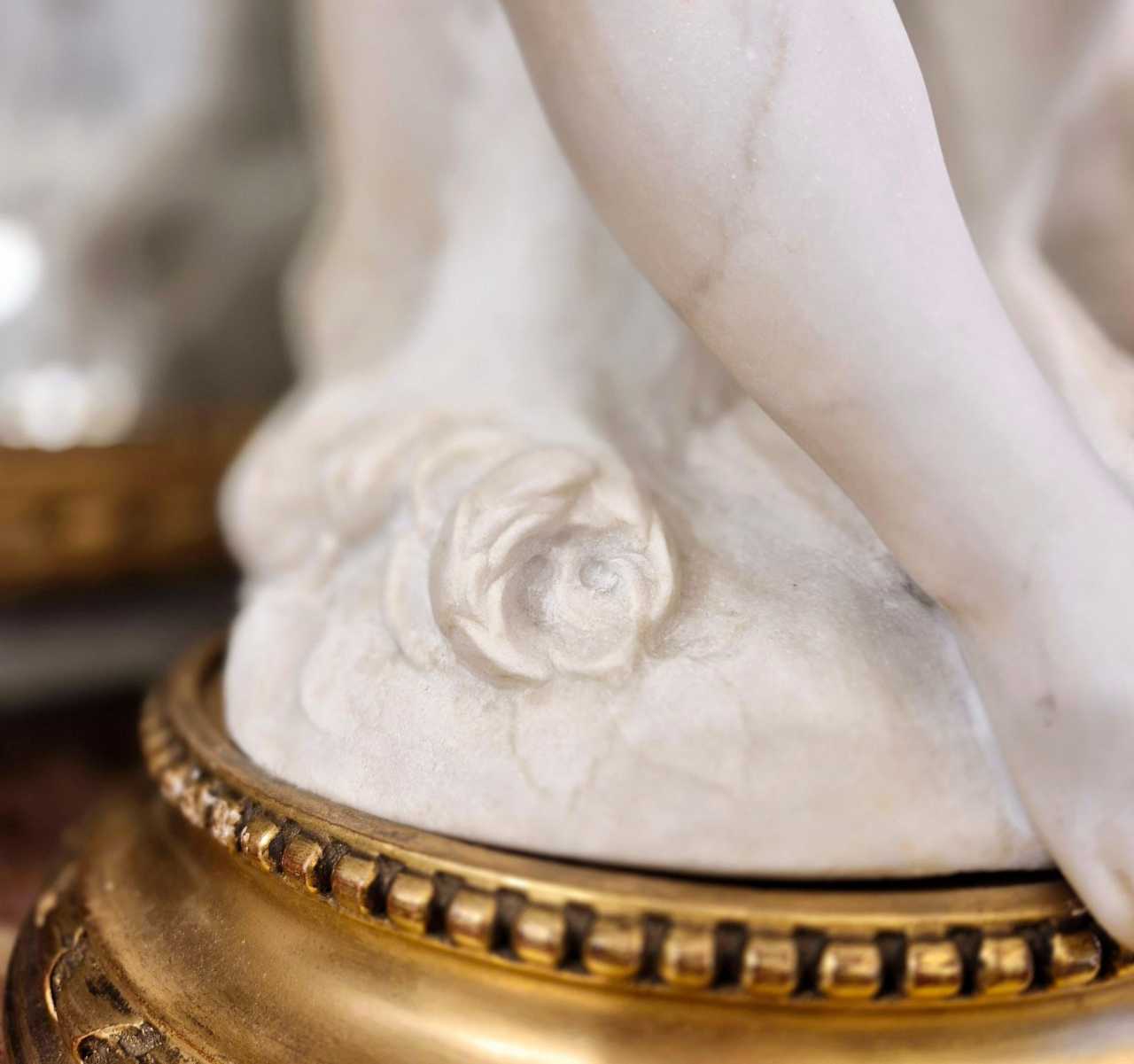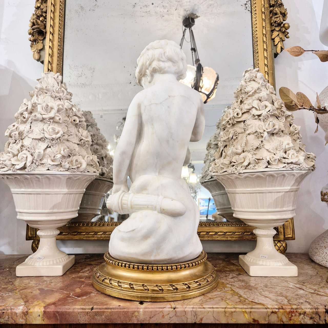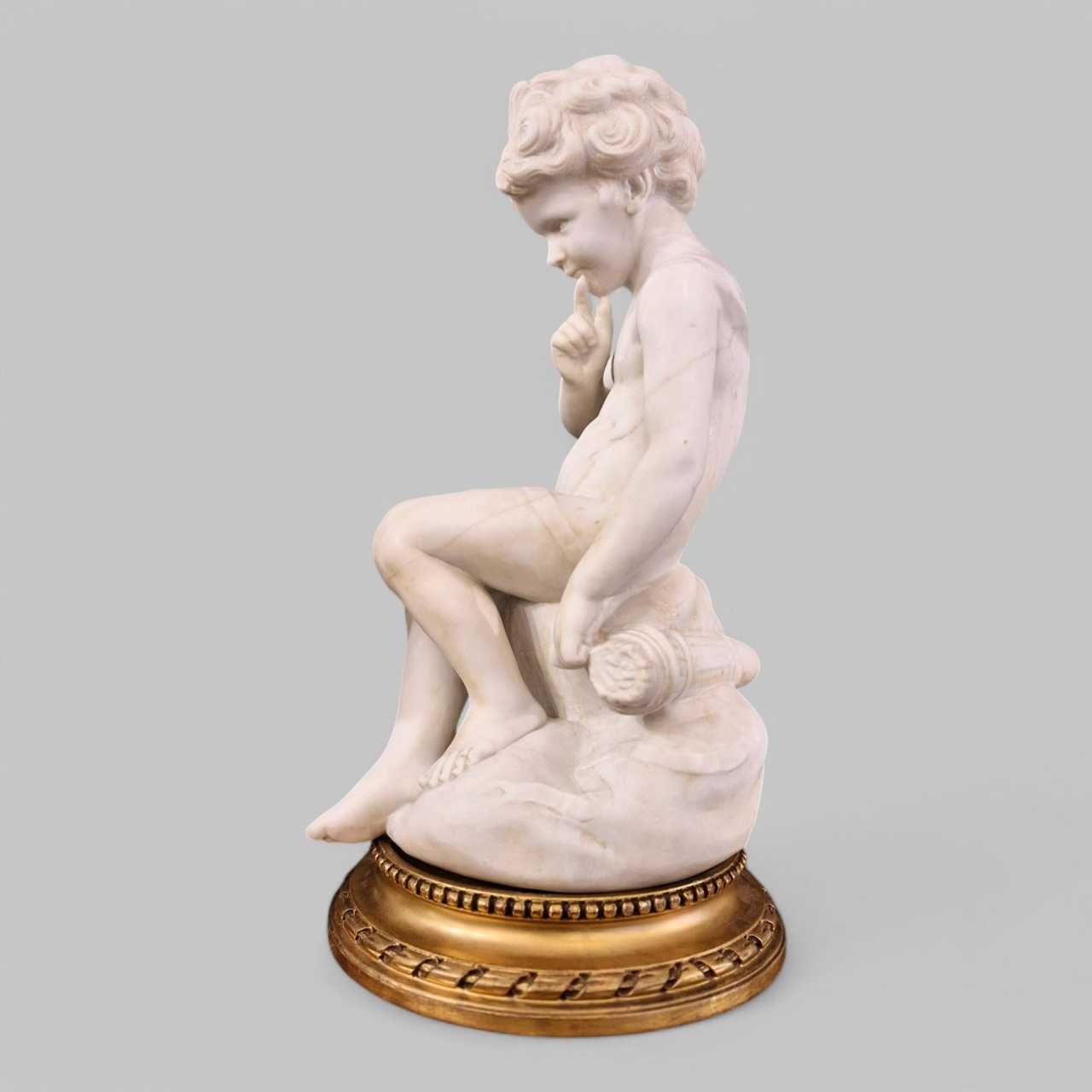 White marble sculpture of Cupid based on a work by Étienne Maurice Falconet (1716-1791), the original of which is in the Louvre Museum in Paris. It is presented on a gilded wooden base with a pearl stripe.Very fine craftsmanship and high quality for this 19th-century white veined Carrara marble statue of Cupid.Height with base: 59 cm.Weight: 30 kg.The original work, also known as “LAmour menaçant”, was commissioned by Mme de Pompadour, whose plaster model was exhibited at the Salon of 1755. The marble statue, presented at the Salon two years later, adorns the gardens of the Hôtel dÉvreux, the future Palais de lÉlysée, the Marquises Parisian residence. The iconography is that of Silent Love: seated on clouds, the mischievous Cupid asks for silence as he draws an arrow from his quiver.Born into a modest family in Paris, Étienne Maurice Falconet started out as a carpenters apprentice. However, his talent for wood and clay sculpture soon attracted the attention of Jean-Baptiste Lemoyne, who took him under his wing. For almost ten years, Falconet perfected his art in his masters workshop. Thanks to François Boucher, he became close to the Marquise de Pompadour, an influential patron of the arts and favorite of Louis XV, who commissioned several works from him, including La Jardinière, intended for the dairy of her Château de Crécy.His talent was recognized in 1754 with his sculpture Milon de Crotone, which earned him membership of the Académie royale de peinture et de sculpture. The works he exhibited at the Salons of 1755 and 1757, notably LAmour menaçant - commissioned by Madame de Pompadour - placed him among the most renowned sculptors of his time. This recognition opened the doors to the royal porcelain factory at Sèvres, where he directed the sculpture workshops between 1757 and 1766. He played a major role in the success of the “cookie de Sèvres”, porcelain sculptures left unglazed and undecorated, and created over 70 figure models, featuring both feminine and childlike forms.In 1766, recommended by Frédéric Melchior Grimm and Diderot, Falconet was invited to St. Petersburg by Catherine II of Russia. After Madame de Pompadours death, he accepted the offer and left his Parisian studio in the rue dAnjou - nicknamed “la chaumière” by Diderot. In Russia, he spent twelve years creating the Monument à Pierre le Grand, an imposing equestrian statue. However, tensions with the imperial court led him to leave the country for the United Provinces, before returning to France.Back in Paris, he was appointed rector of the Académie royale de peinture et de sculpture. Here, he produced several masterpieces, including Moïse et David pour léglise Saint-Roch, Les Mangeurs de raisins, La Leçon de flûte, Pygmalion, Alexandre, LHiver and La Mélancolie. In 1780, he was replaced by Charles-Antoine Bridan as professor of sculpture.Falconet was also a theorist of his art. He translated and annotated passages on painting and sculpture from Pliny the Elders Natural History, and wrote several works on the history of art in Antiquity and in his own time. Diderot entrusted him with writing the “Sculpture” article for LEncyclopédie. In 1761, he published his Réflexions sur la sculpture, followed by other writings in six volumes from 1781.