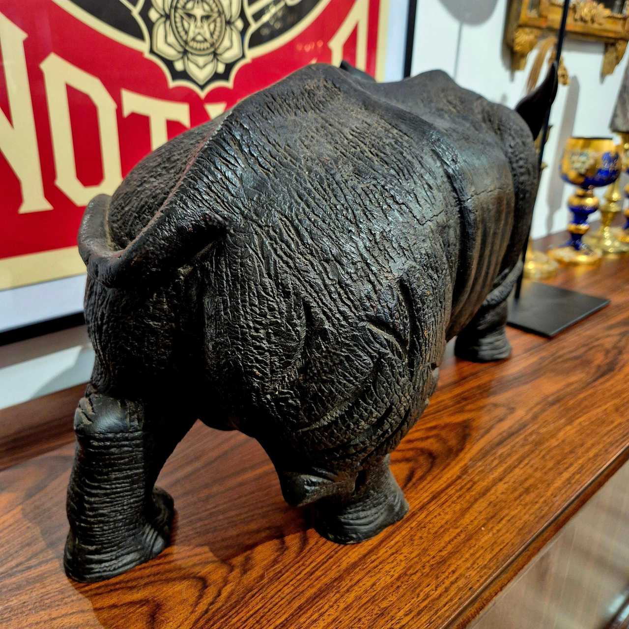 Superbe rhinocéros en bois massif sculpté : le travail de sculpture est en effet admirable par sa finesse et l’attention portée aux détails ; il présente également une magnifique patine brillante et douce à certains endroits.Une pièce de caractère étonnante et originale qui convient pour un intérieur classique comme contemporain.