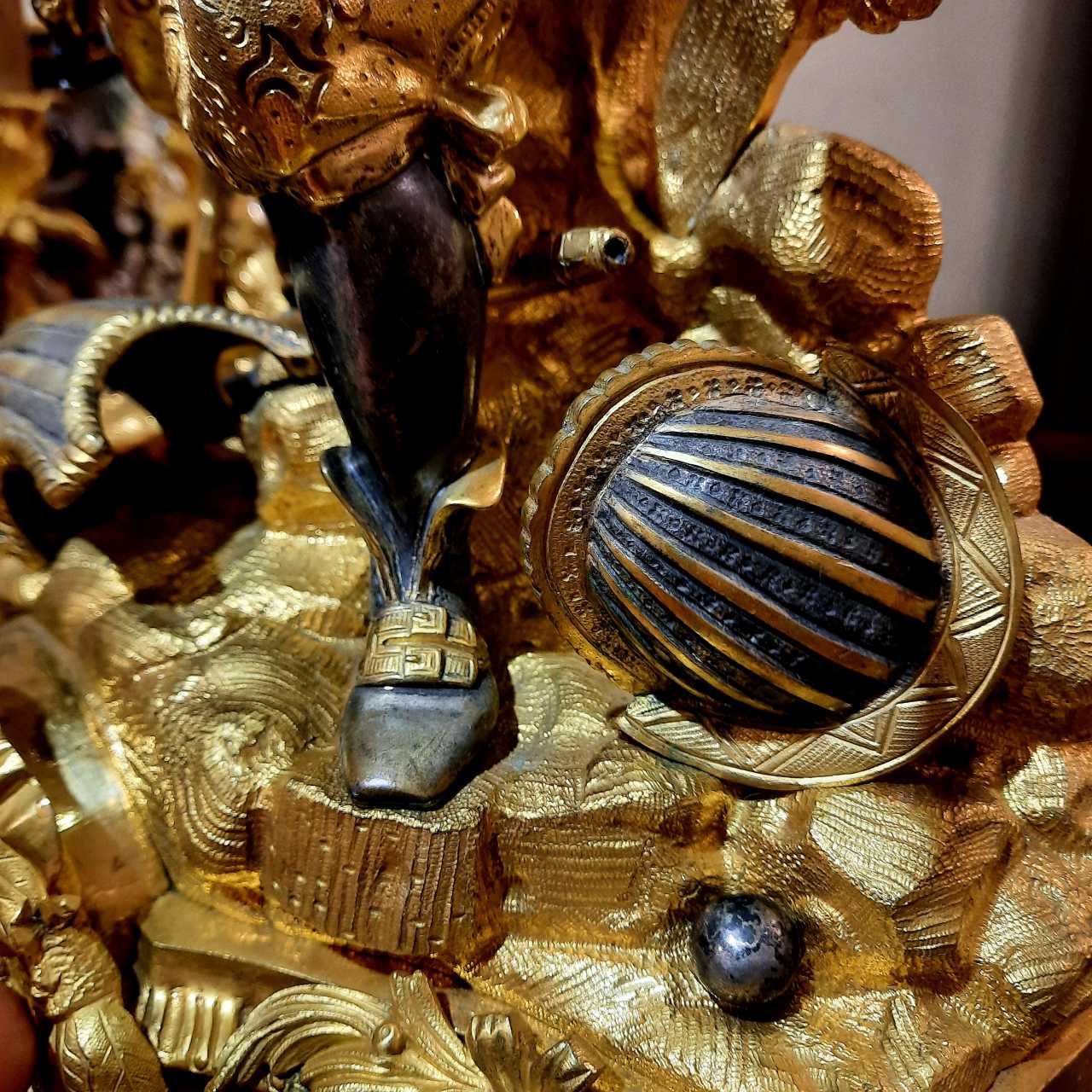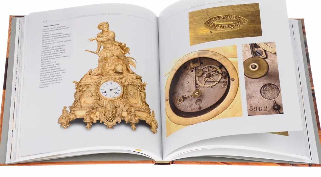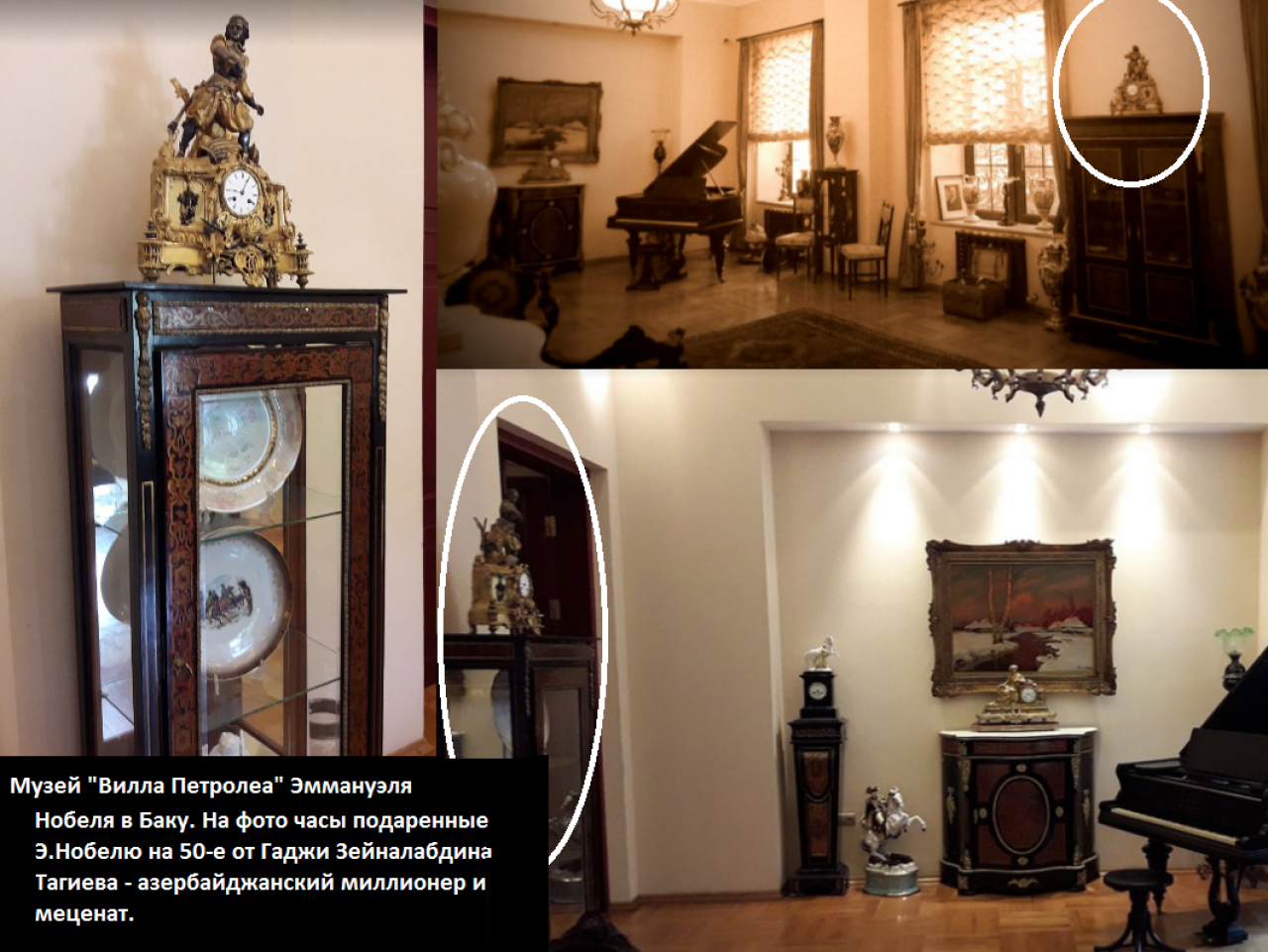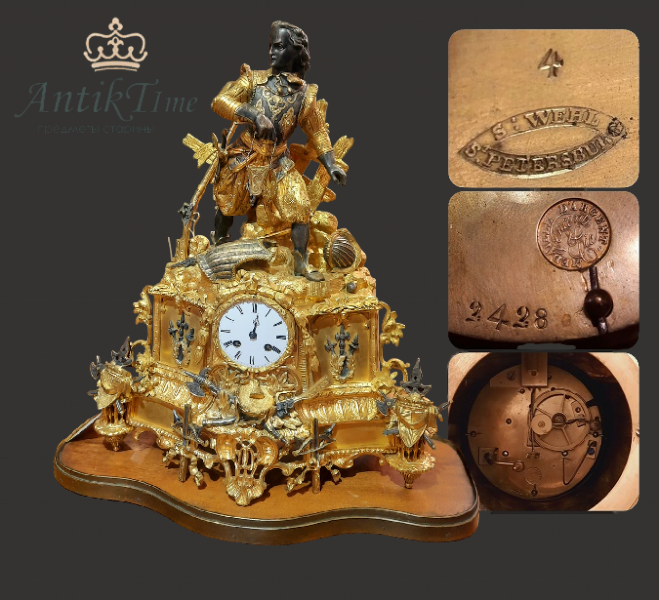 54х25х45см. На задней стенке корпуса нанесено именное клеймо миндалевидной формы «S: WEHL S. PETERSBURG» и цифра 4 , поставщика Двора Его Императорского Величества бронзолитейной мастерской Самуила Веля ( S.WEHL). Механизм фирмы «Vincenti & Cie» с номером 2428 периода 1834–1855 гг., согласно клейму. Бой часовой и получасовой. --------------- Такие часы были подарены на 50-летний юбилей Эммануилу Нобелю миллионером, меценатом, "отцом" Азербайджана Гаджи Тагиевым и находятся в музее семьи Нобель см.фото4. Приёмную Кремлёвской резиденции президента Российской Федерации украшают каминные часы с фигурой немецкого первопечатника Иоганна Гуттенберга и клеймом С. Веля.