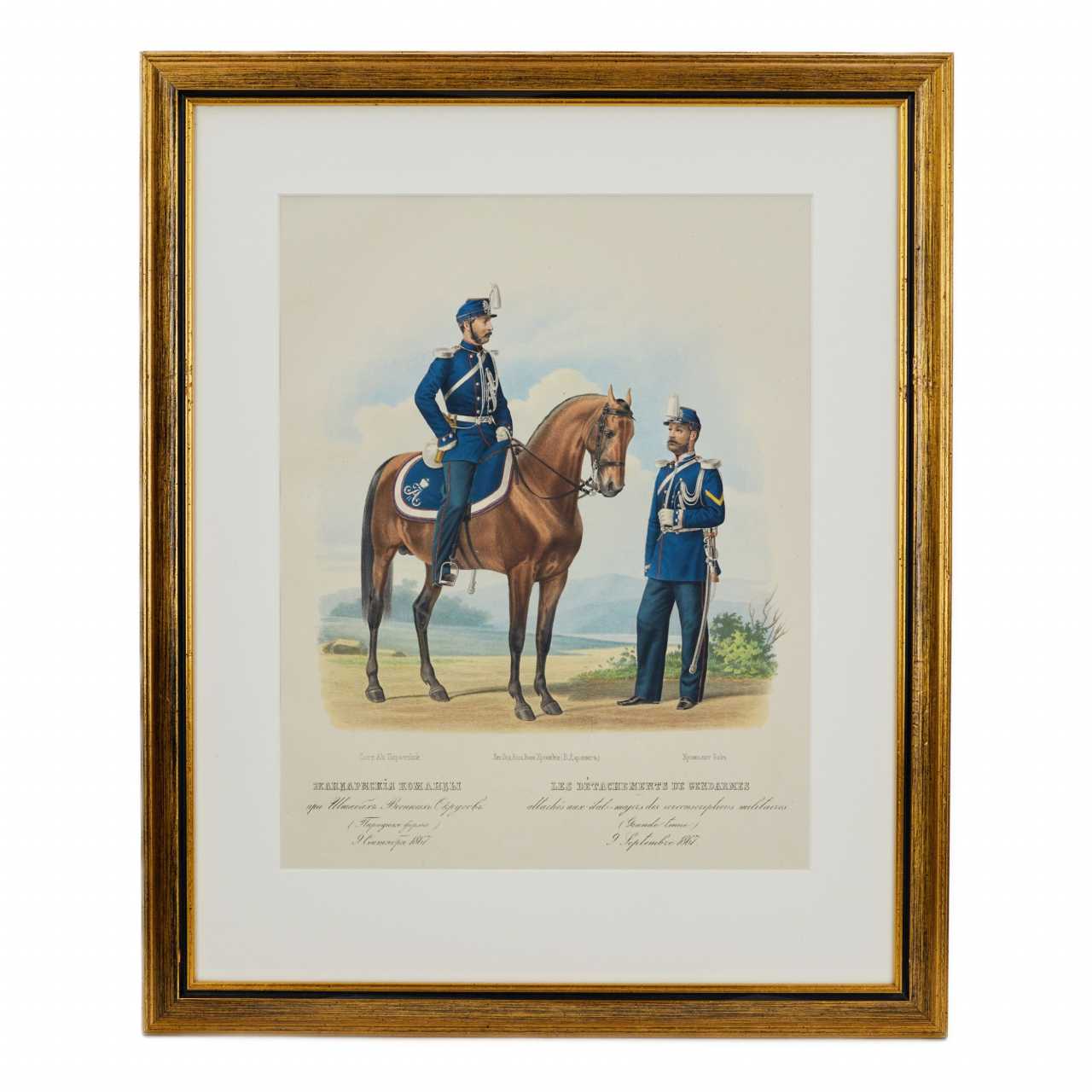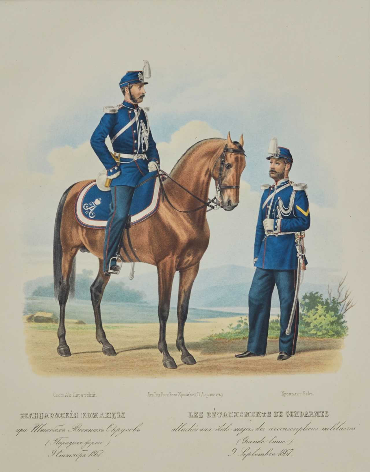 Хромолитография Бека, по литографии редколлегии русской военной хроники В. Дарленга, русской парадной формы жандармской команды военных округов 9 сентября 1867 года. Составитель Ак.Пиратский. Бумага, хромолитография: 34х27 см.