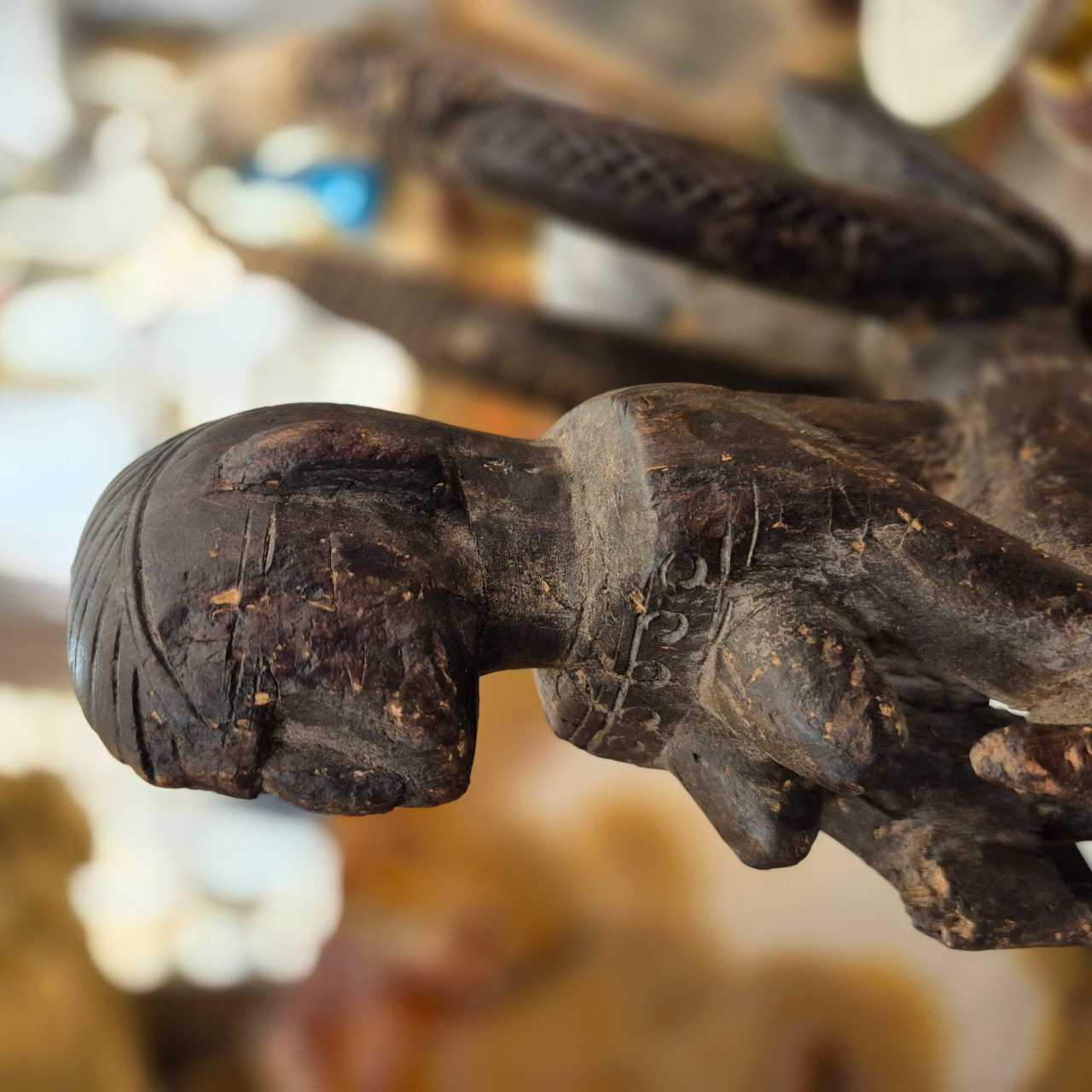 A very pleasing Ciwara crest, singularly small and accompanied by its original headdress, depicting a stylized antelope leaning on a pangolin. The antelope is ridden by a woman, and white horsehair has been added to the tips of the horns. The piece is carefully sculpted, with notches decorating the bodies of the antelope and the pangolin.Rattan, plant fiber, cowries, wood Very fine velvety mat patina, Circa 1950An animal called Ciwara is said to have taught the Bambara how to cultivate the land, and during agrarian ceremonies, they recall the myth through the stylized representation of an antelope whose name ci wara means “fawn of the earth”.During these ritual ceremonies, the mask-cimier became the attribute of a costumed dancer who gave it life and speech.Worn at the top of the skull and held in place by a sort of small wickerwork cap, these crests accompanied the dancers during rituals dedicated to agricultural work.The masks would leap across the field to chase away evil spirits, revive seeds and restore vitality to crops.